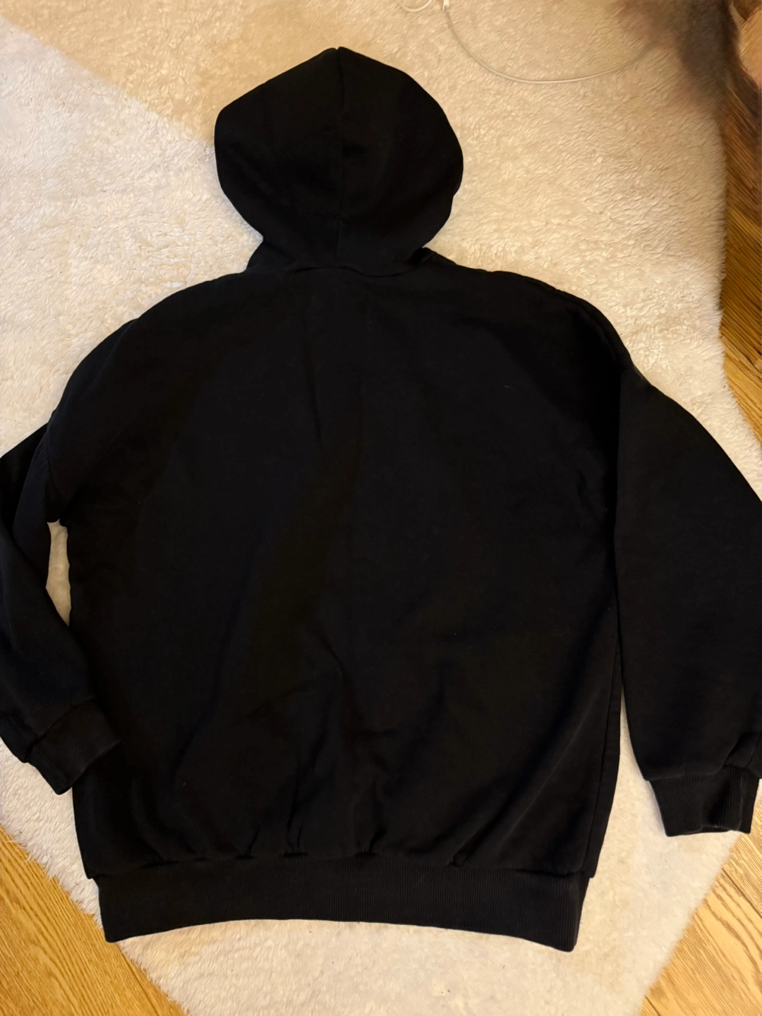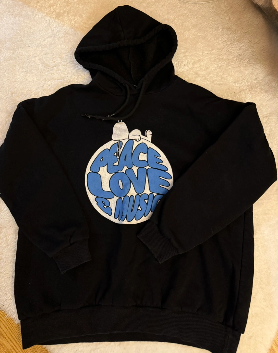 Black oversized hoodie featuring a Snoopy graphic and "Peace Love & Music" text. Drawstring hood. Relaxed fit. Size medium. Great condition. Combine with items from my other listings for a better price deal.