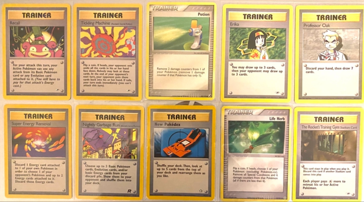 Collection of ten Pokémon trainer cards. Includes various characters and actions. Good condition. Rare base set cards going for higher on eBay. Mint condition and highly sought after.