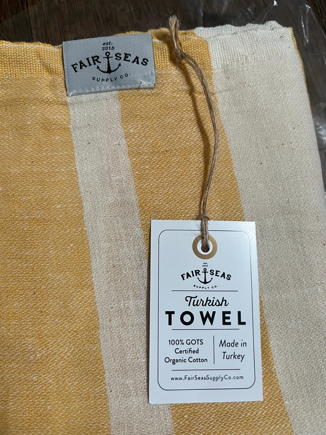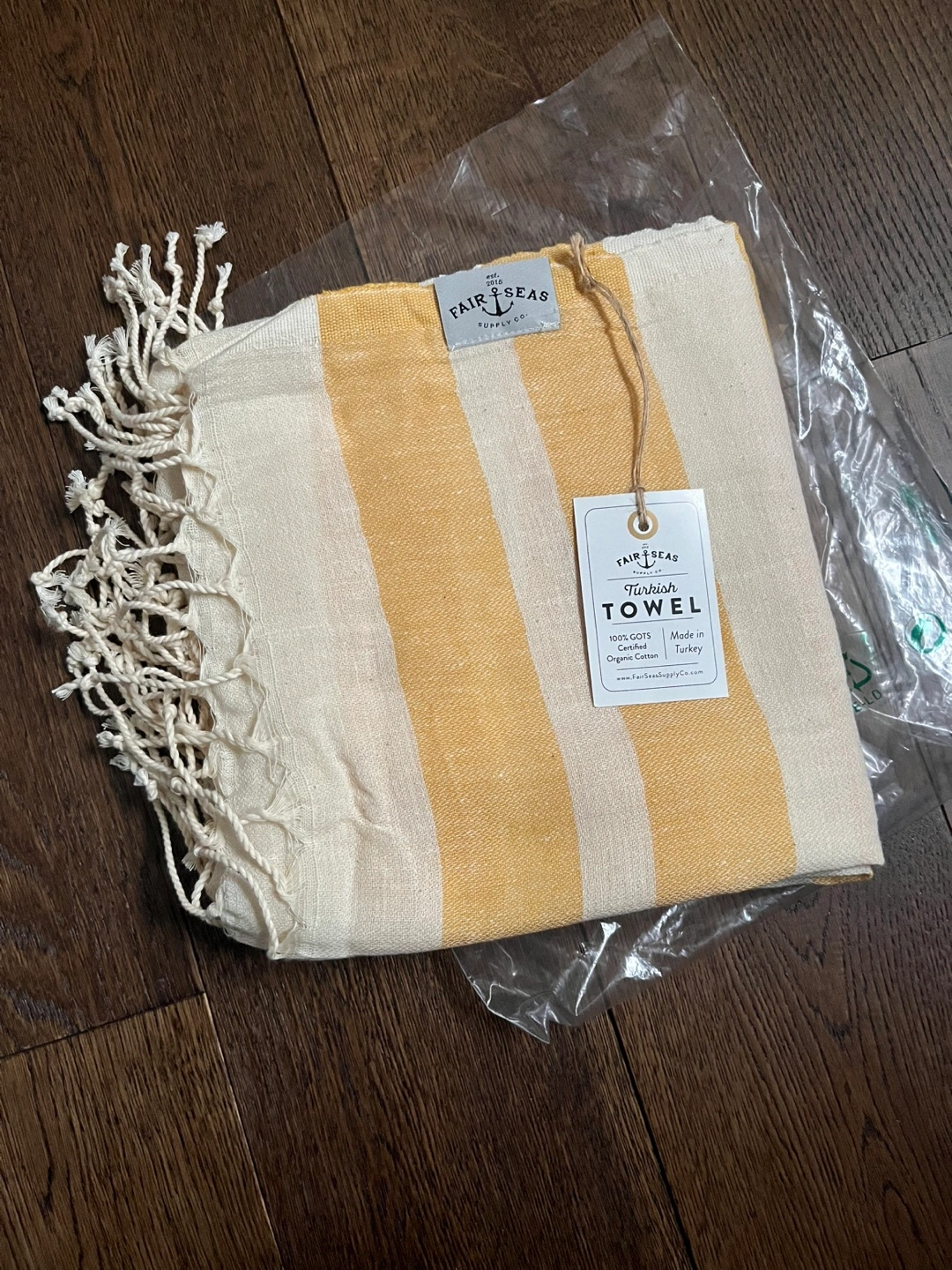 Brand new Turkish towel. 100% GOTS certified organic cotton. Made in Turkey. Features yellow and white stripes and tassels. Perfect for the beach or bath.