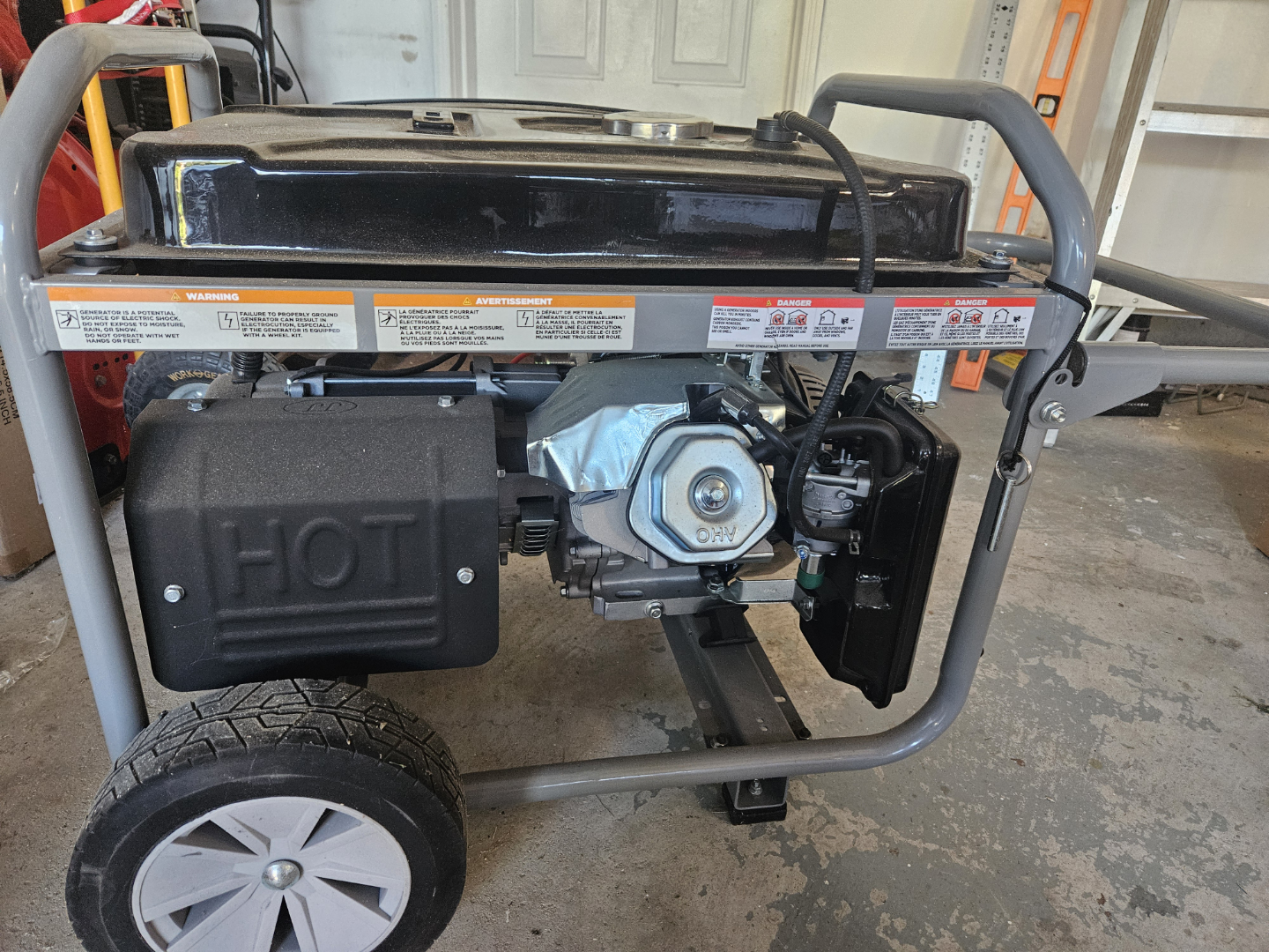 Gas-powered generator. Features electric start, multiple outlets, and hour meter. Cast iron sleeve for long life. Portable, includes wheels.