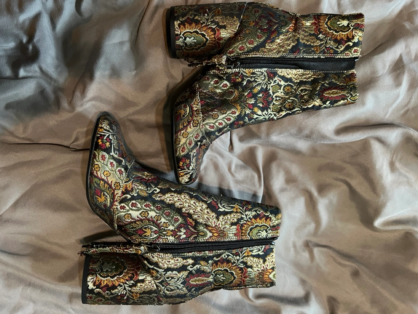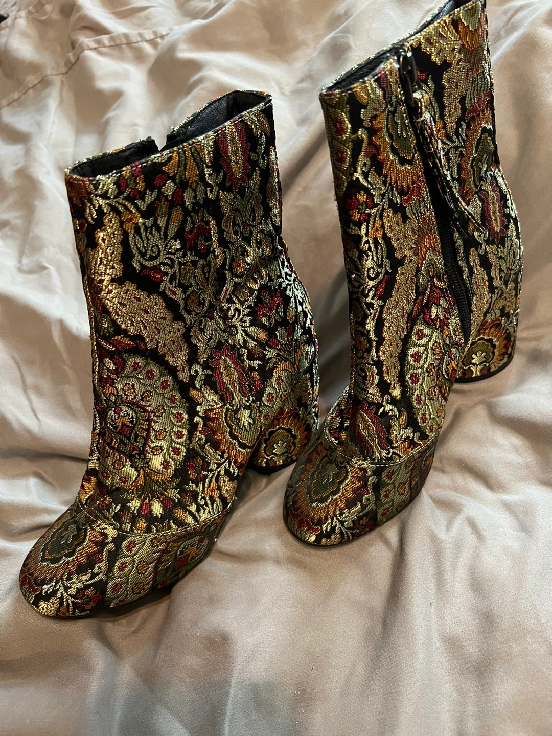 Women's ankle boots. Block heel. Side zipper closure. Floral brocade pattern. Multicoloured. Size 36.