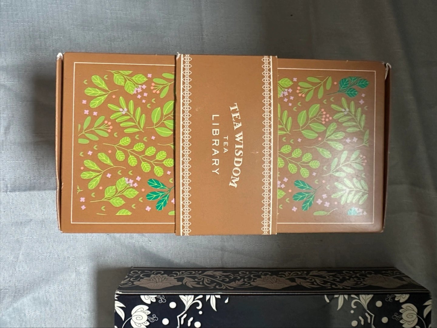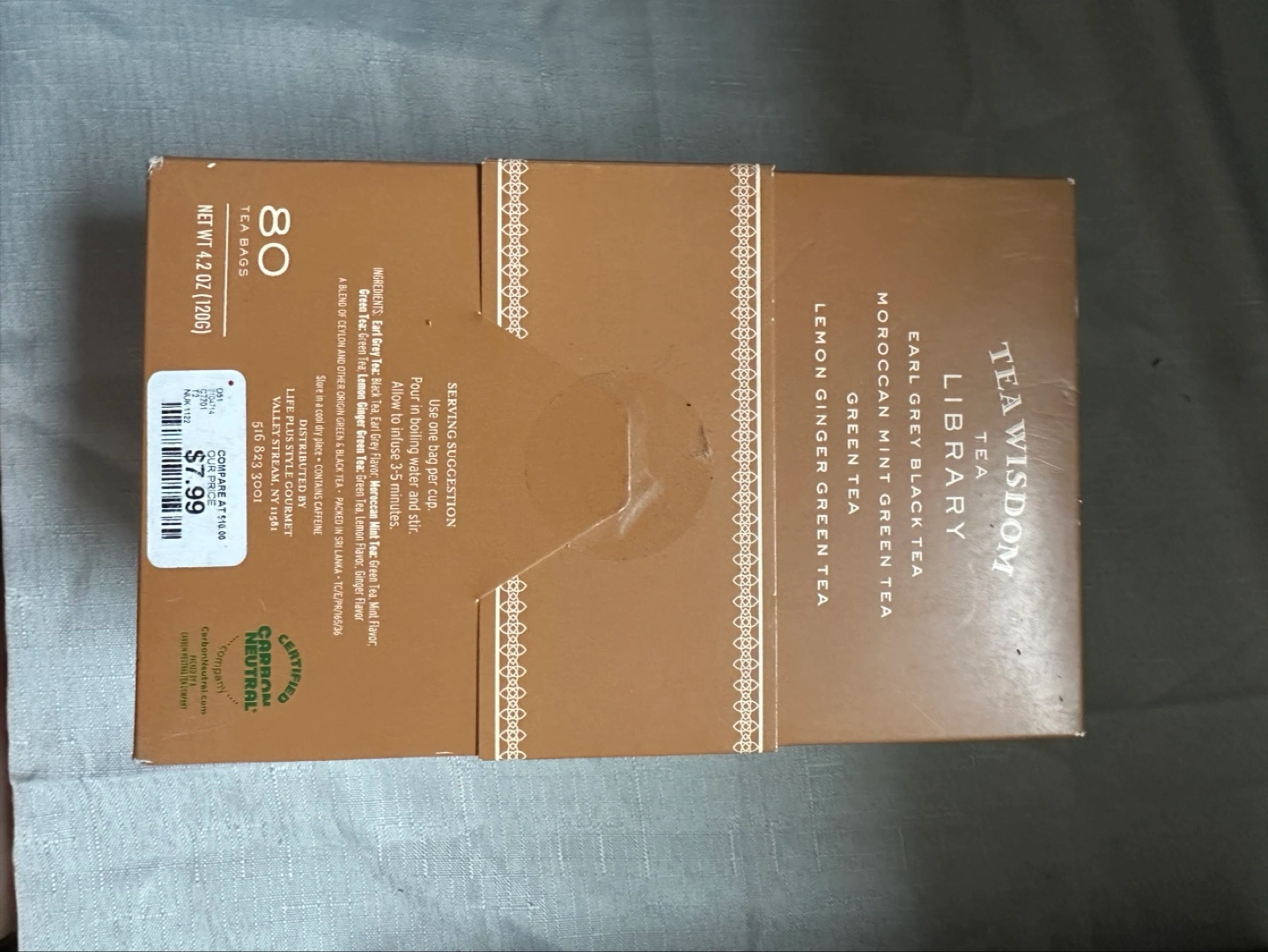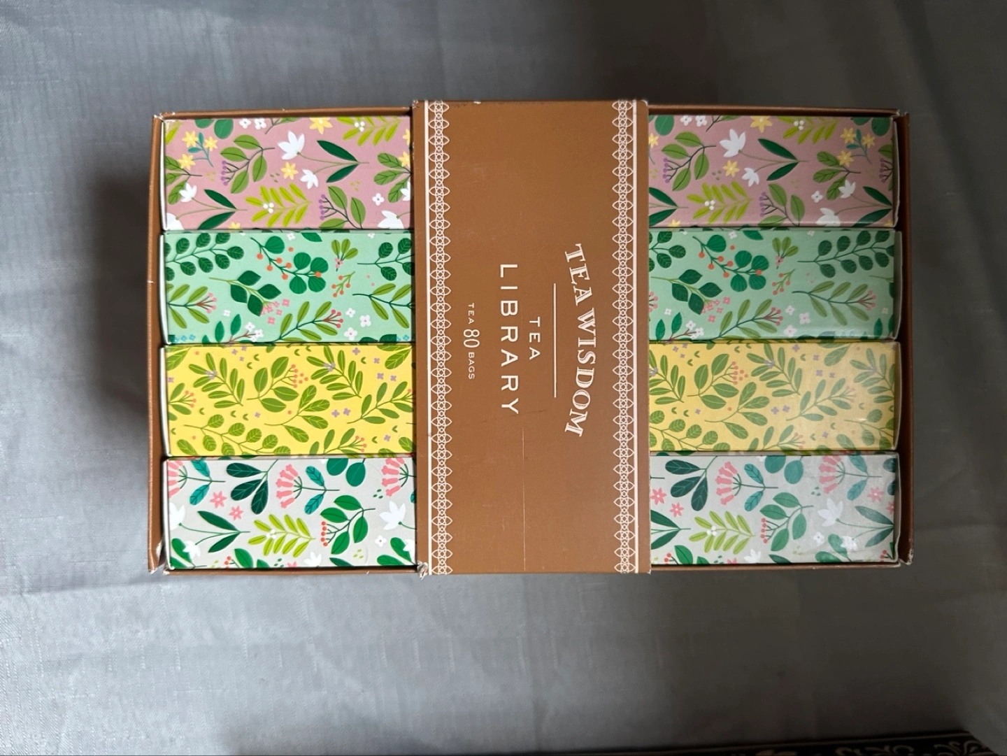 New, unopened box of 80 tea bags. Four unique tea flavors included: Moroccan Mint Black Tea, Earl Grey Black Tea, Lemon Ginger Green Tea, and Green Tea. Pretty box, great gift!