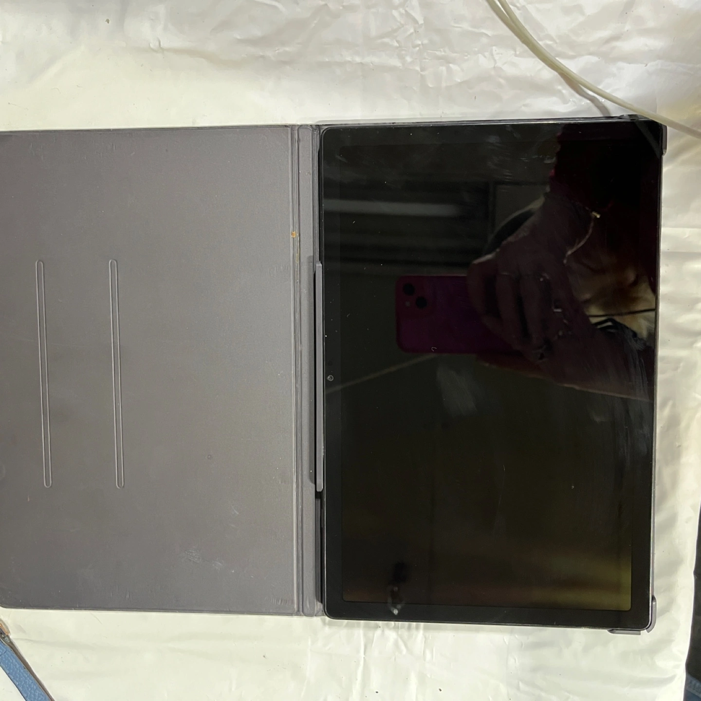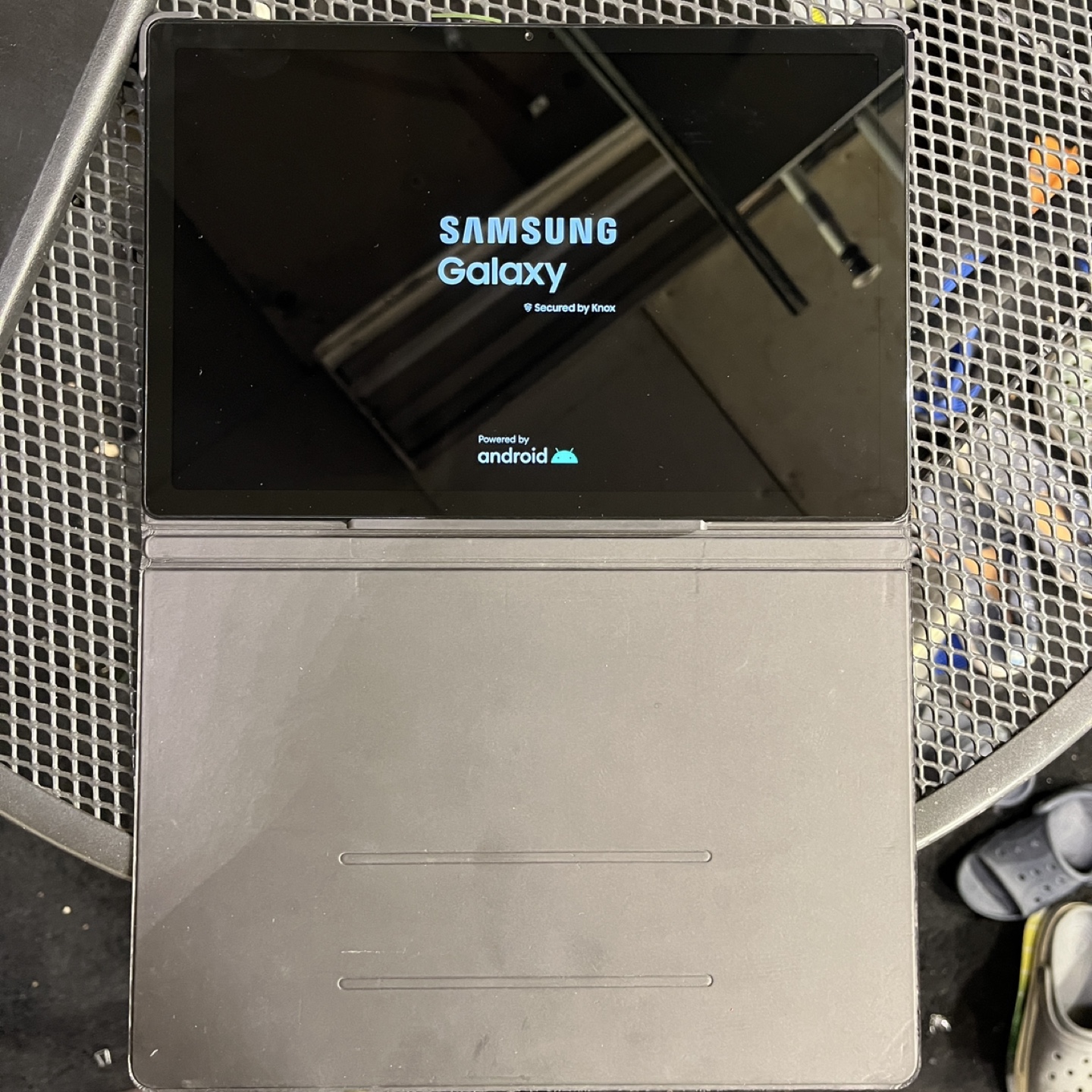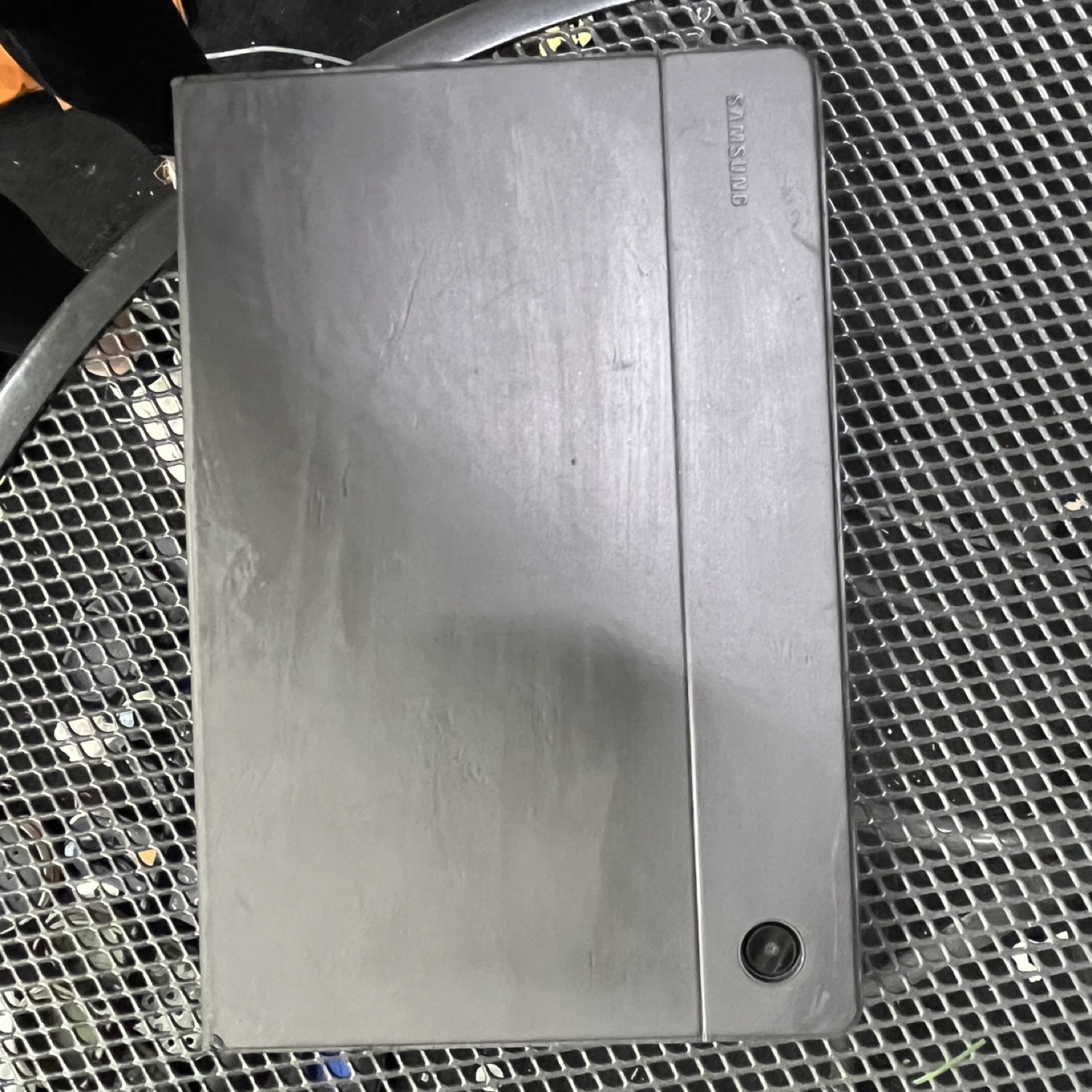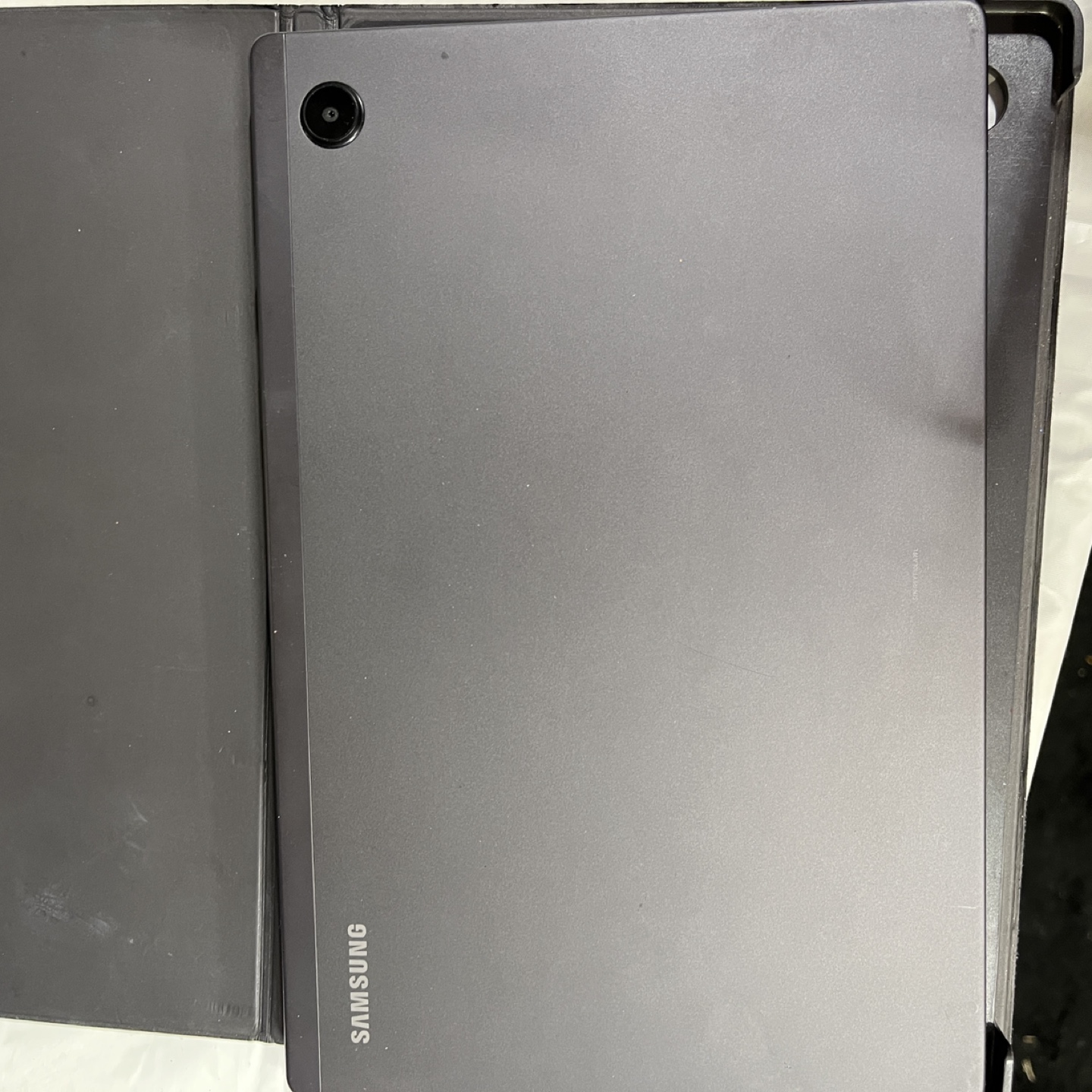 Used Samsung Galaxy Tab. Black. Android operating system. Includes case. Good condition.
