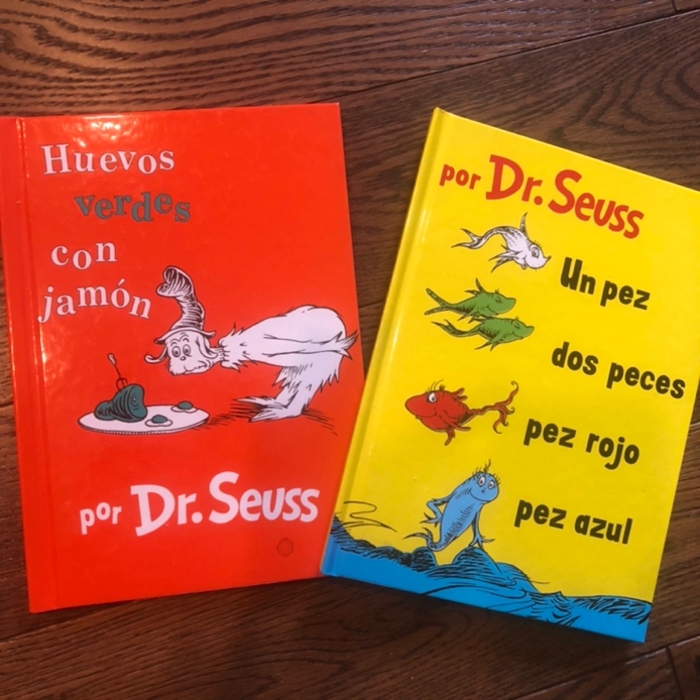 Dr. Seuss books. One is *Green Eggs and Ham* and the other is *One Fish Two Fish Red Fish Blue Fish*. Both books are in Spanish
