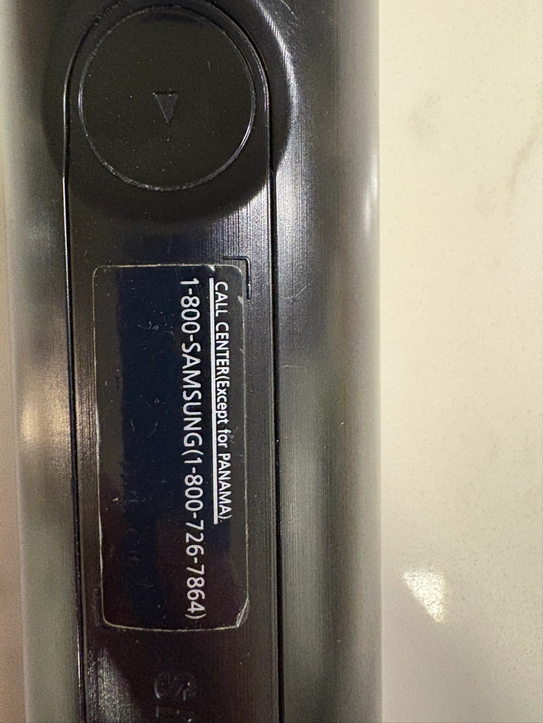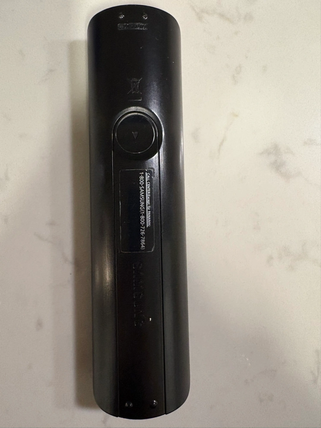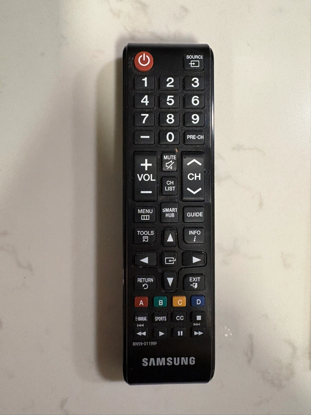 Black Samsung Smart TV remote. Model BN59-01199F. Features volume, channel, and menu controls. Includes Smart Hub and other functions.