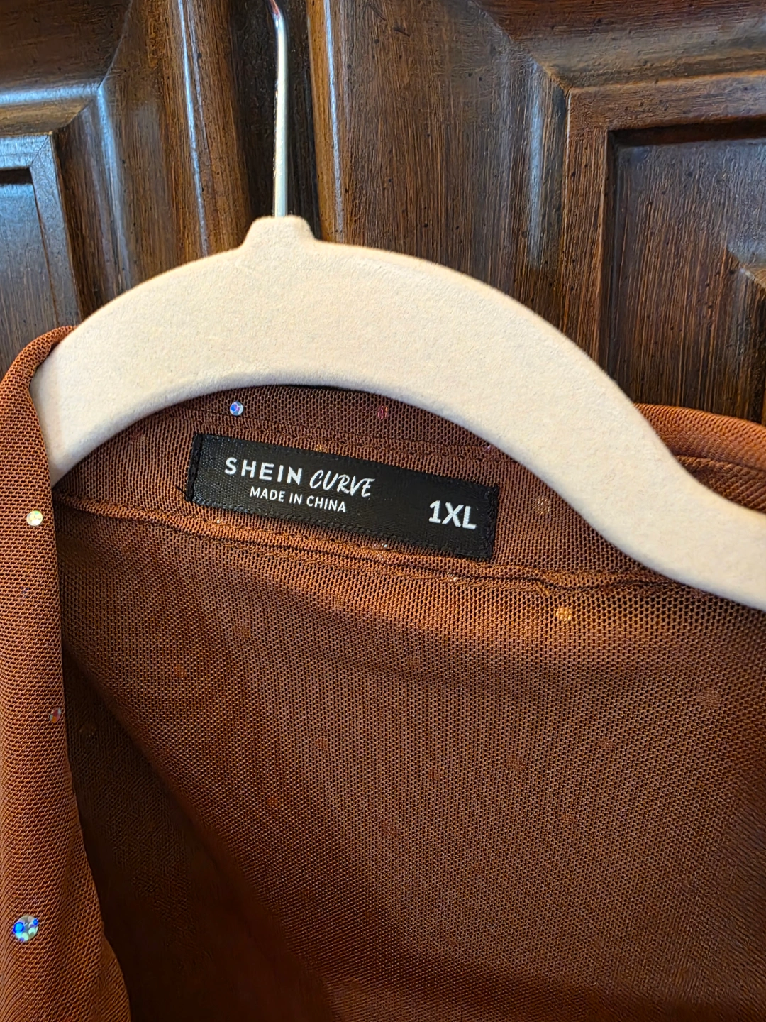 Long sleeve sheer blouse. Brown colour. Cowl neck. Embellished with iridescent rhinestones. Size 1XL. Never Worn.