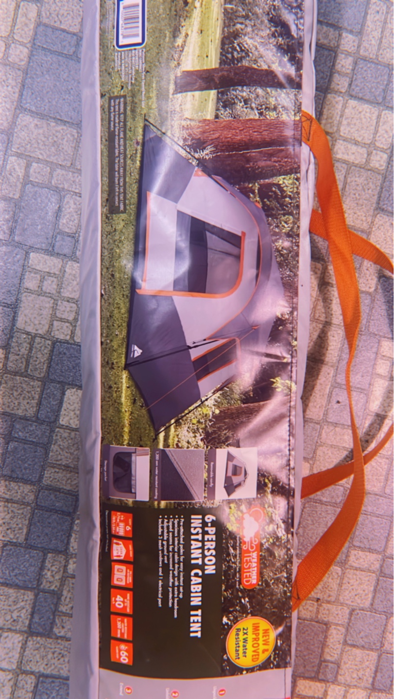 New and unopened Coleman 6-person instant cabin tent. Grey and orange. Easy setup. Perfect for camping.