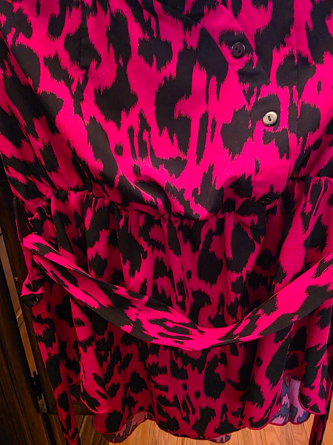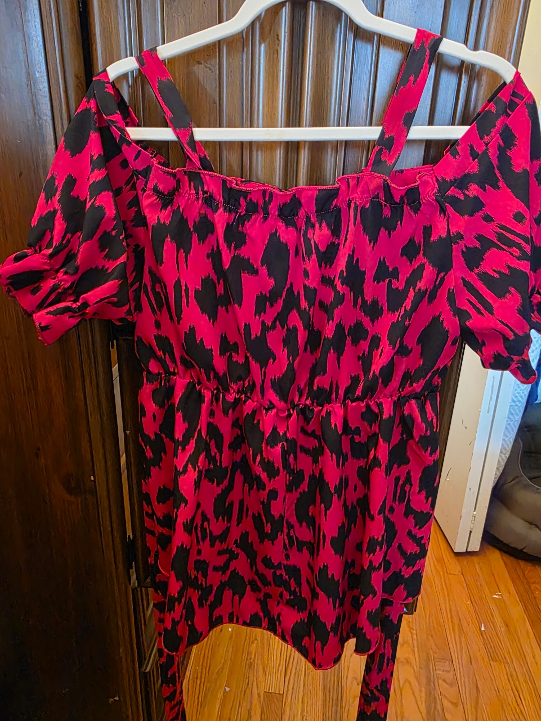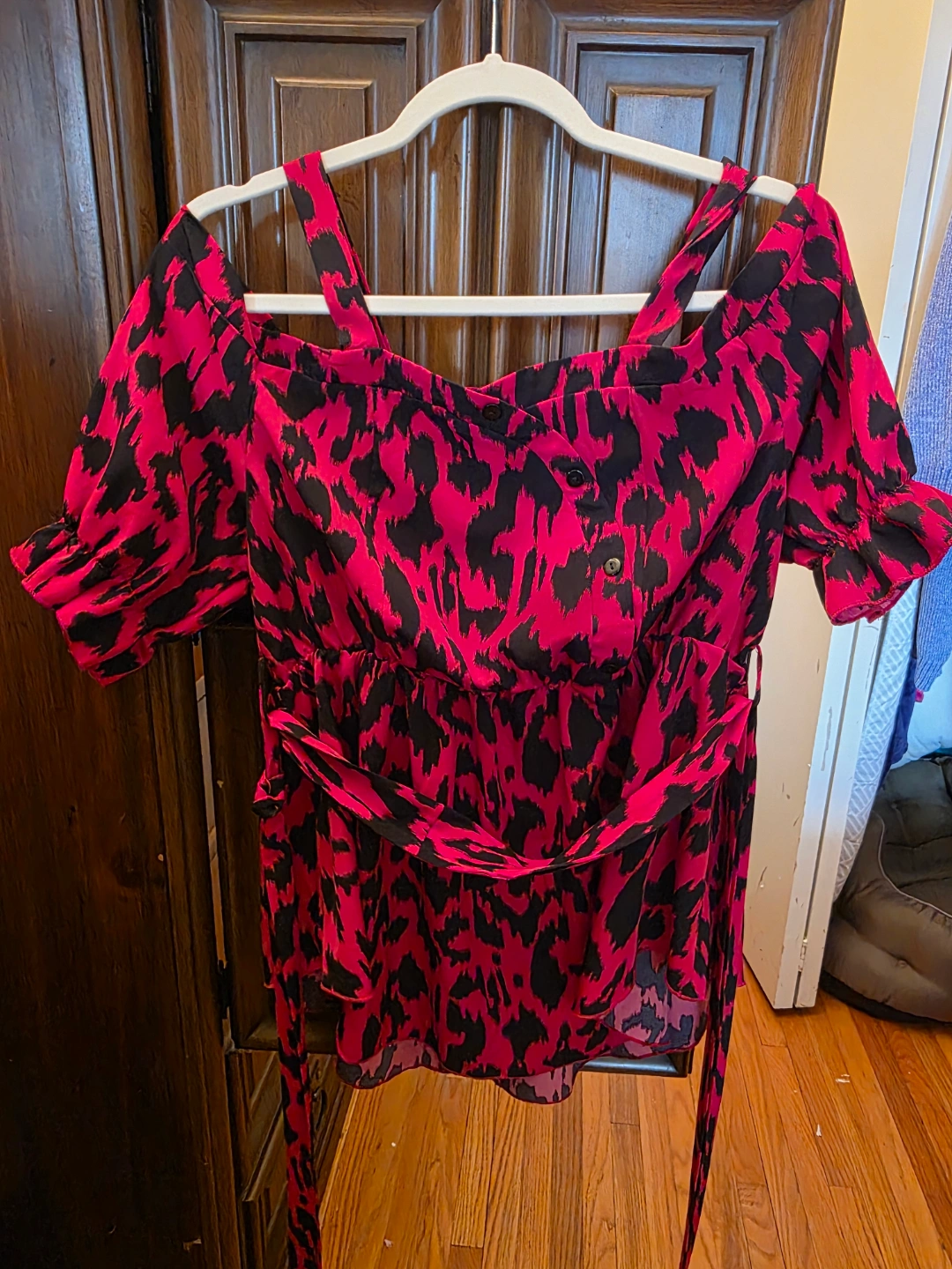 63Women's 1XL blouse. Red and black leopard print. Cold shoulder style. Short sleeves. Comes with a self-tie belt. Sleeves hang off shoulder.