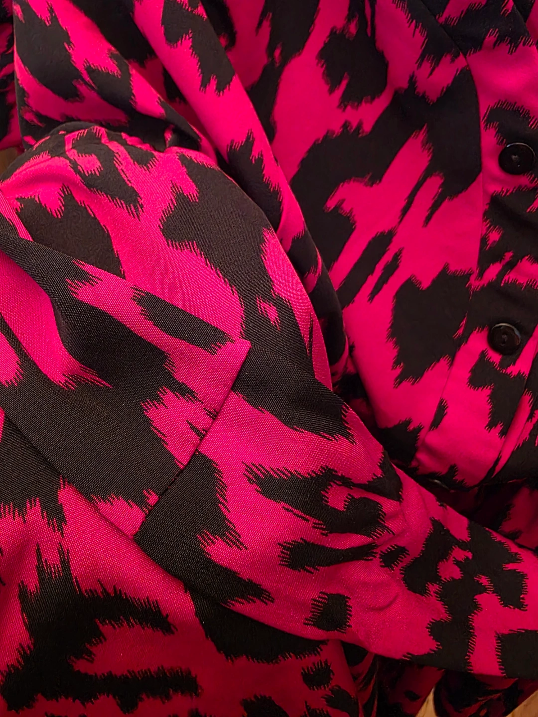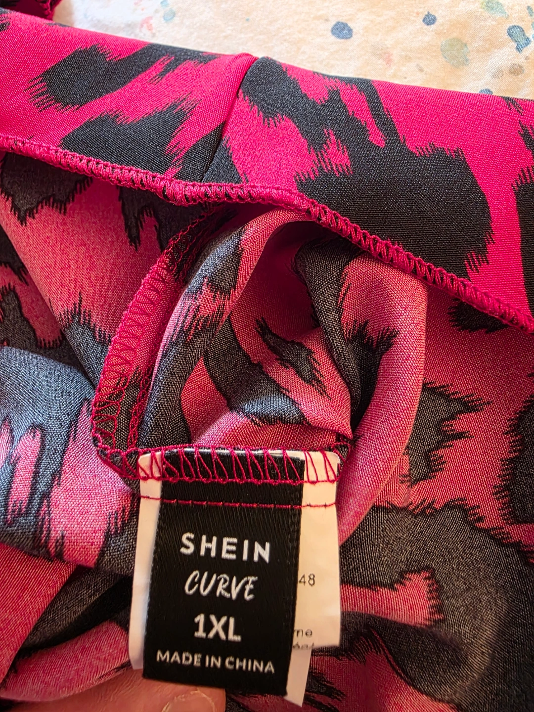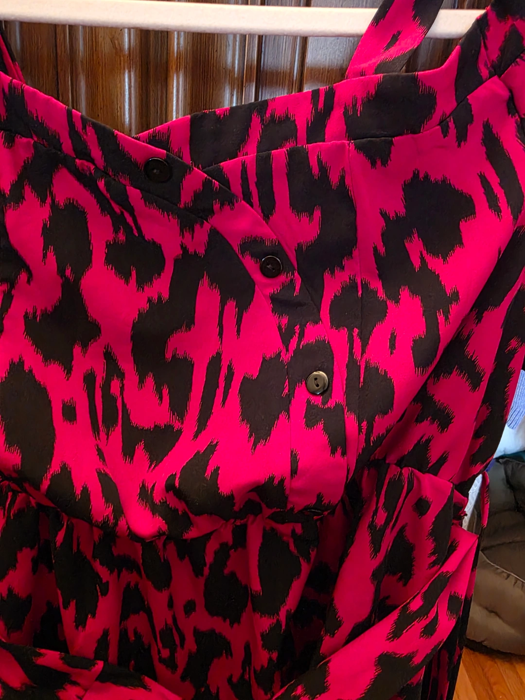 63Women's 1XL blouse. Red and black leopard print. Cold shoulder style. Short sleeves. Comes with a self-tie belt. Sleeves hang off shoulder.