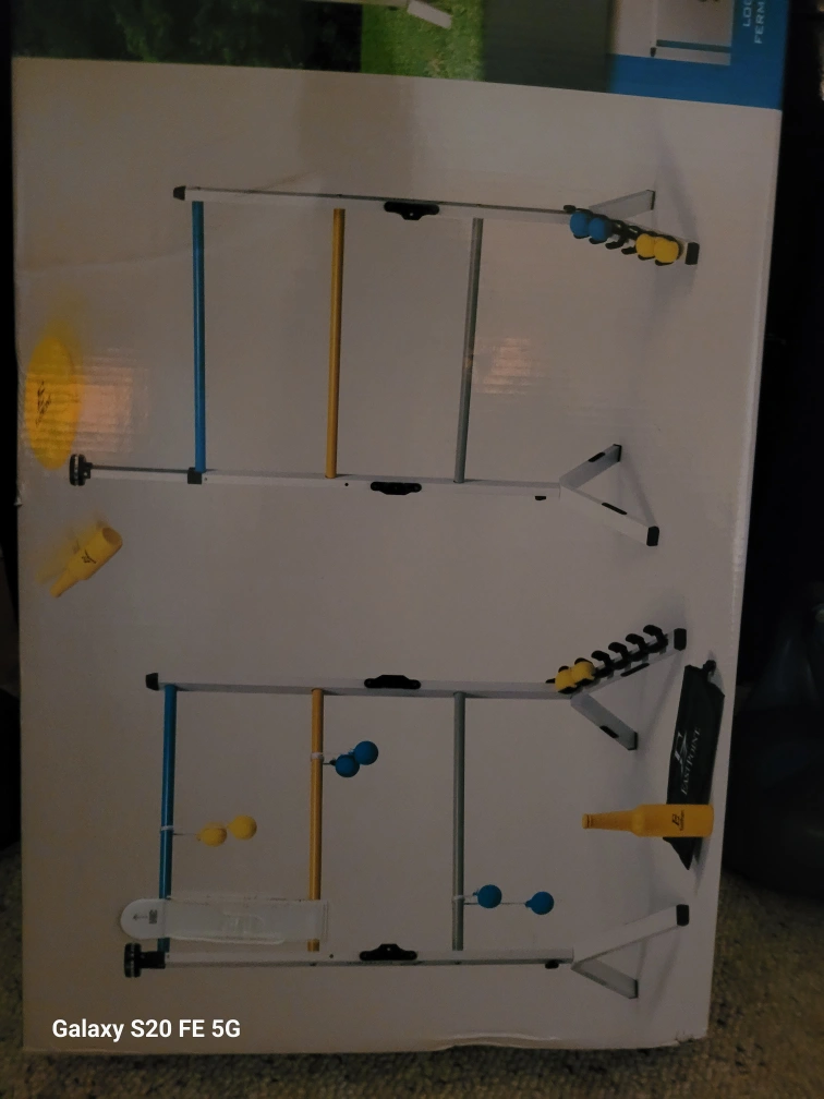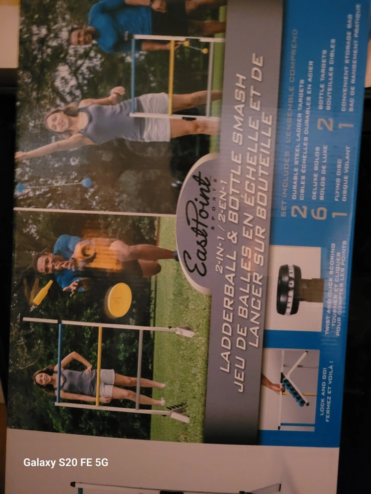 New in box. Two games in one! Ladder toss and bottle toss. Includes two ladders, balls, and bottles. Great for outdoor fun.