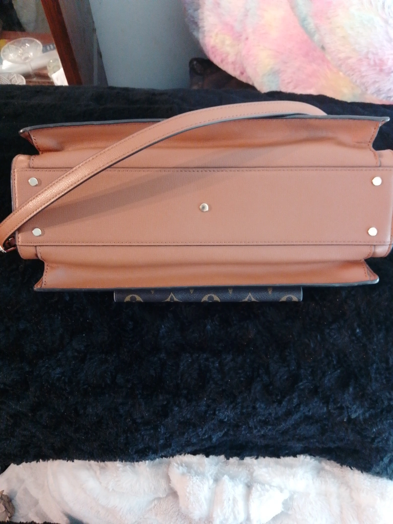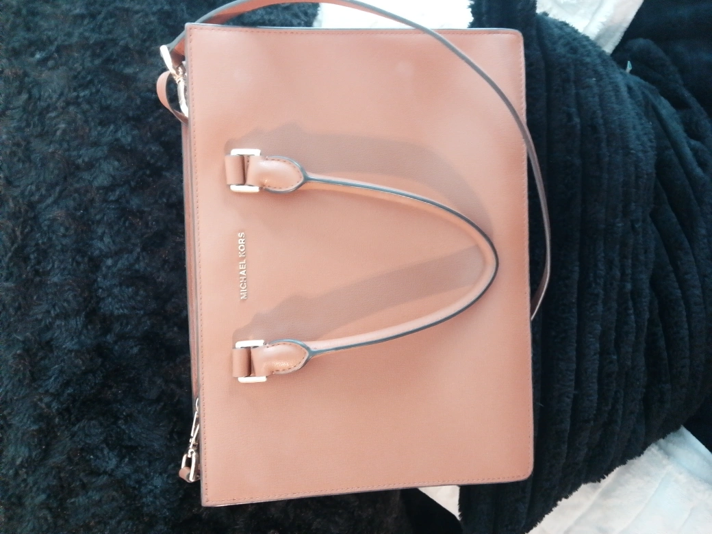 Stylish light brown satchel. Features two top handles and a detachable shoulder strap. Gold-toned hardware accents. Zip closure.