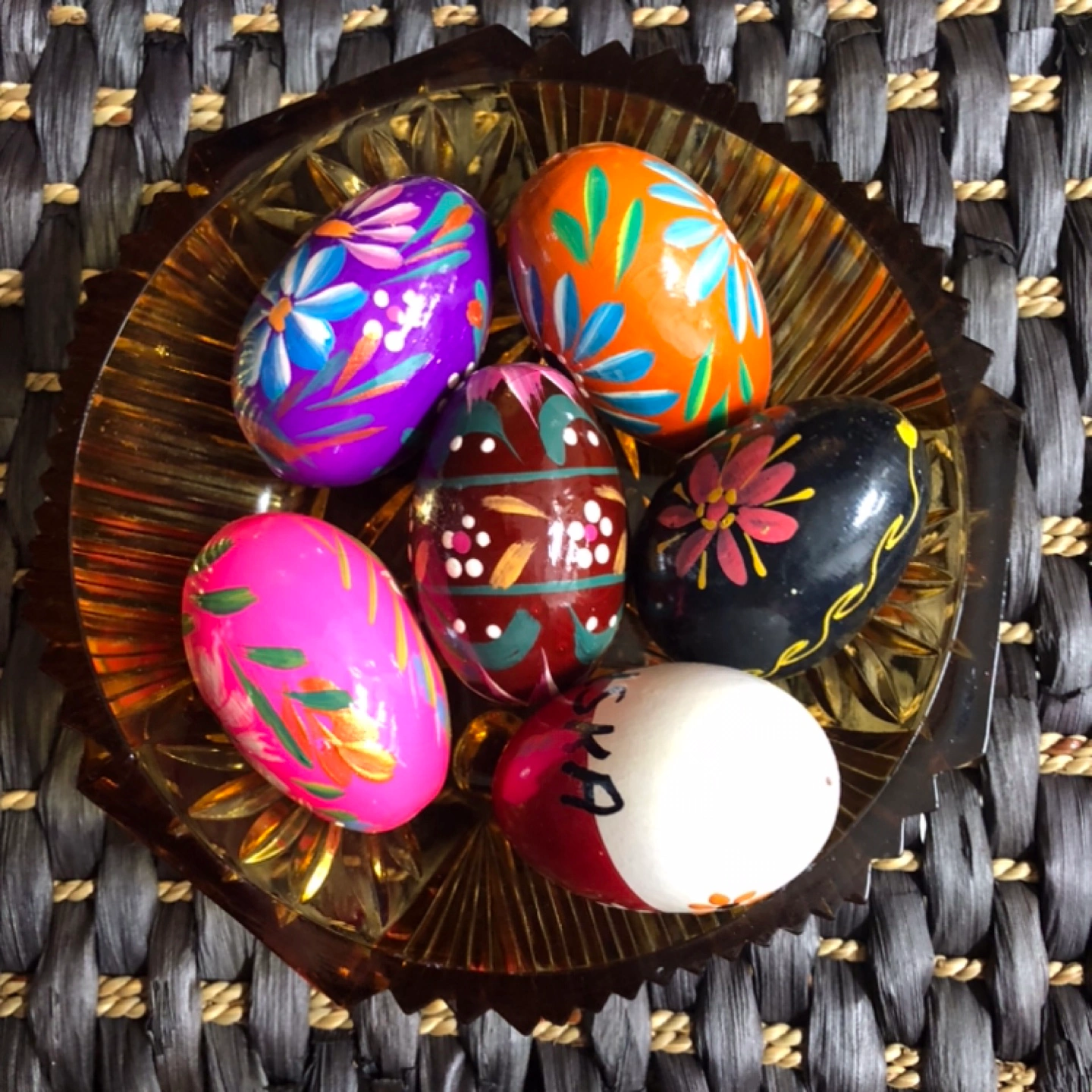 4 decorative Polish Easter eggs (Pisanki) hand-painted wood with floral designs. Various colours and patterns. $ 9 each, or last 4 for $30 Vintage footed Amber glass bowl $15. Perfect for Easter decor or a unique collectible.