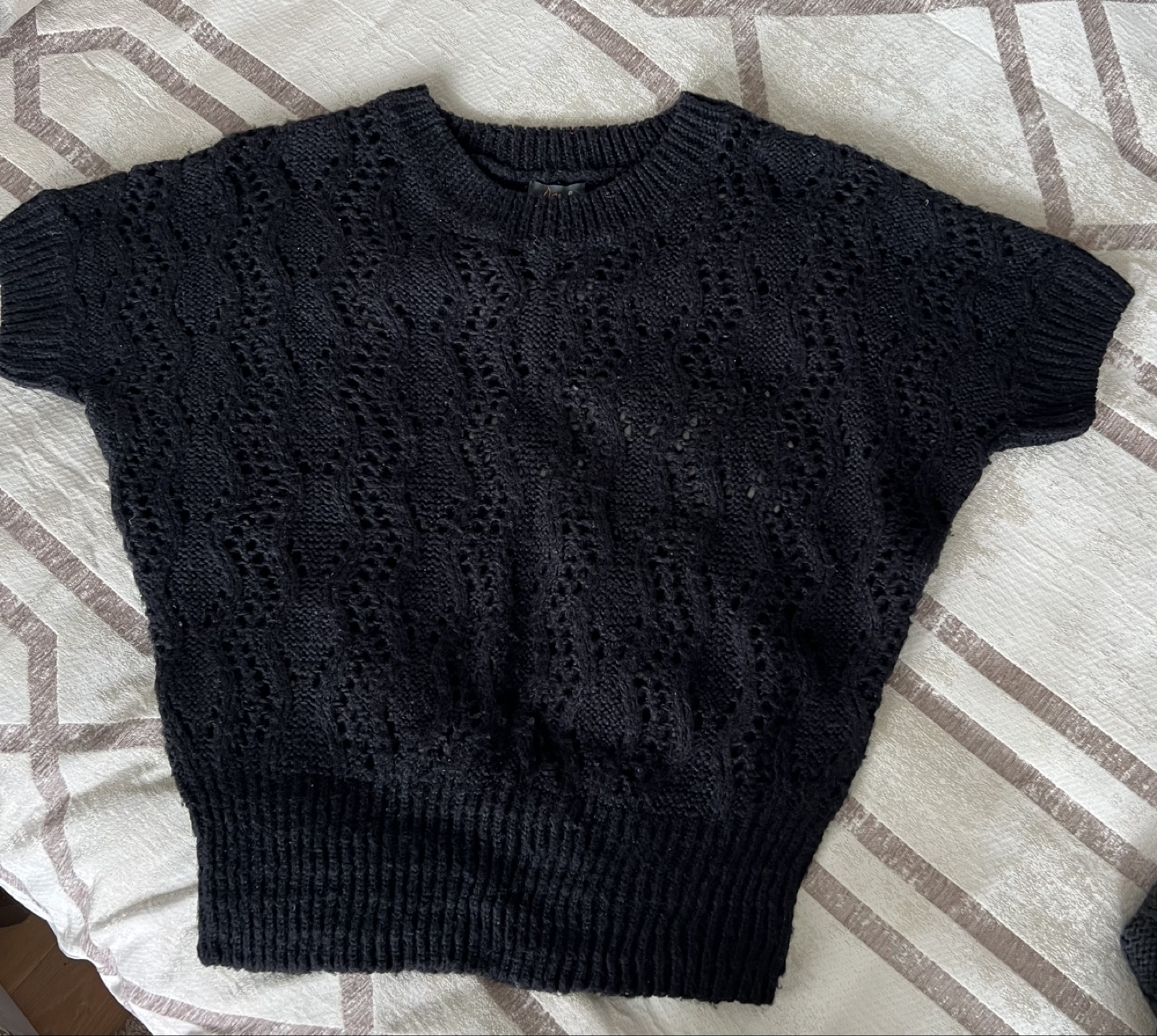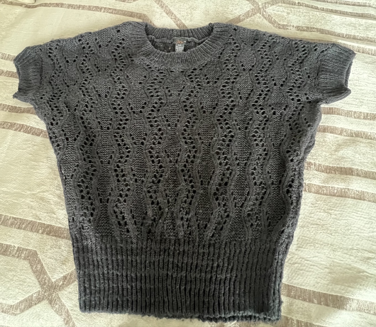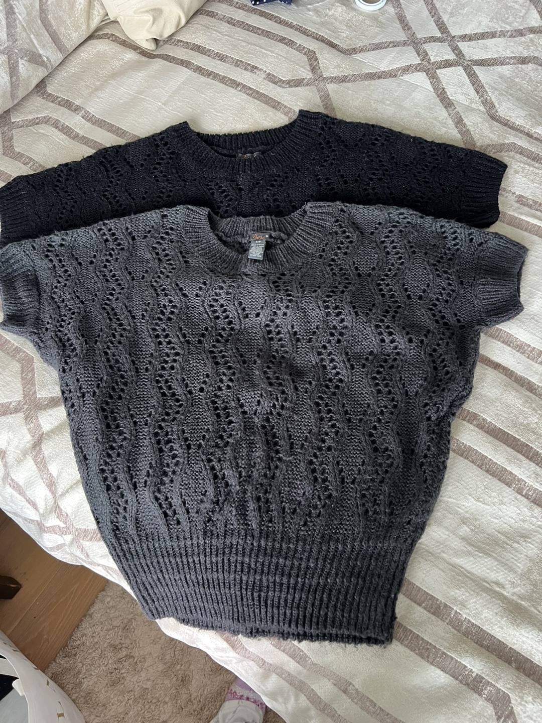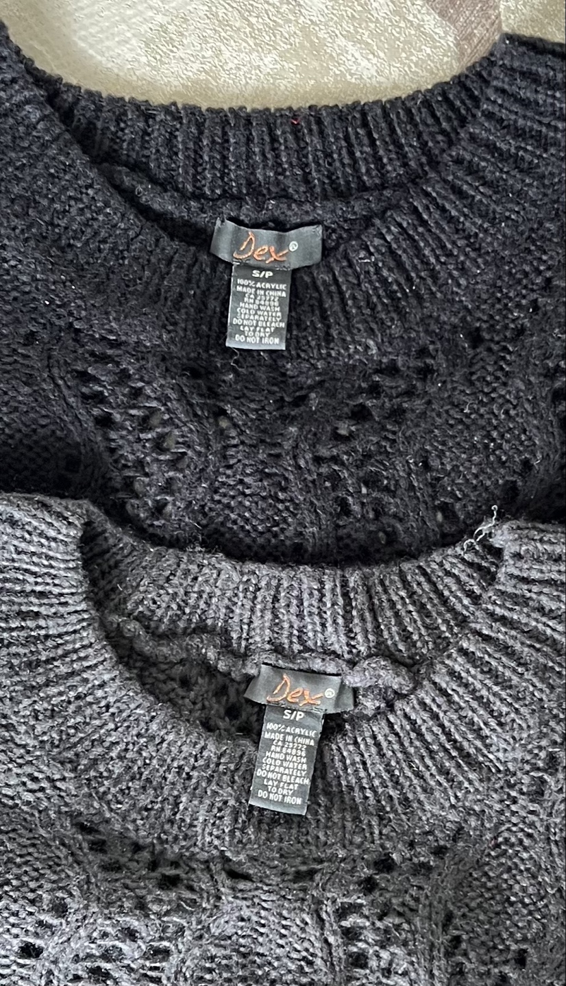 Pair of women's Dex brand sweaters. Size small. Short sleeves. Dark grey and black colours. Open knit design. Excellent condition.