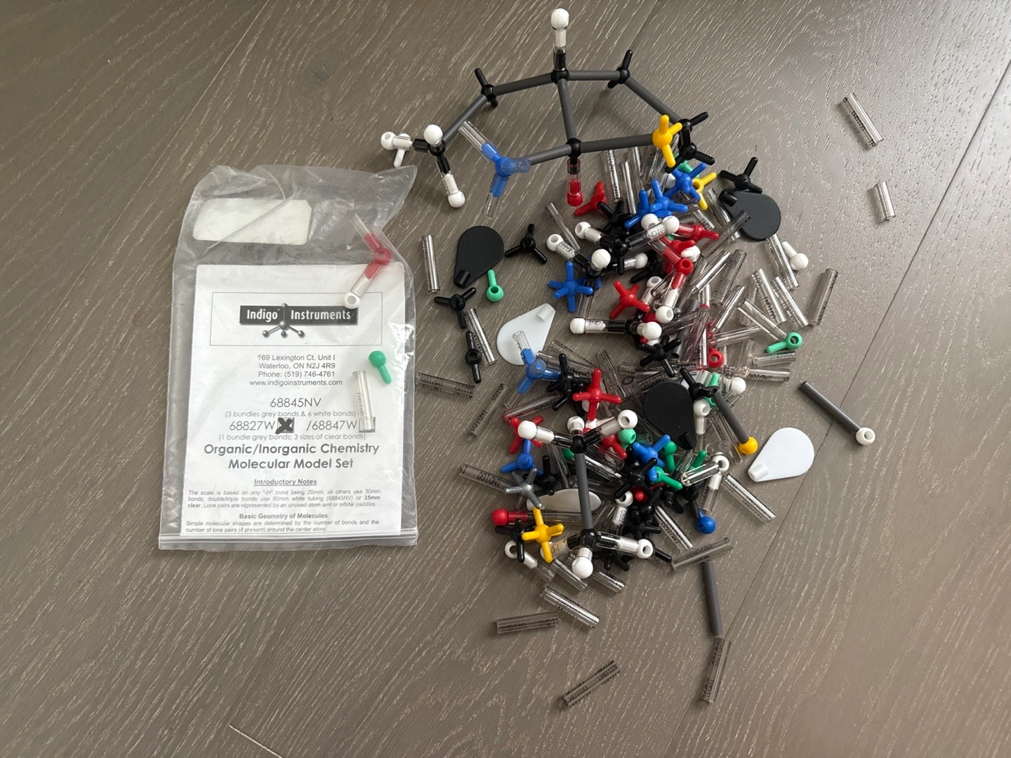 Molecular model set. Includes various bonds and atoms. Suitable for chemistry and organic chemistry education. I can meet you in Austin Heights, SFU Burnaby or at the Burquitlan or Lougheed Skytrain stations.