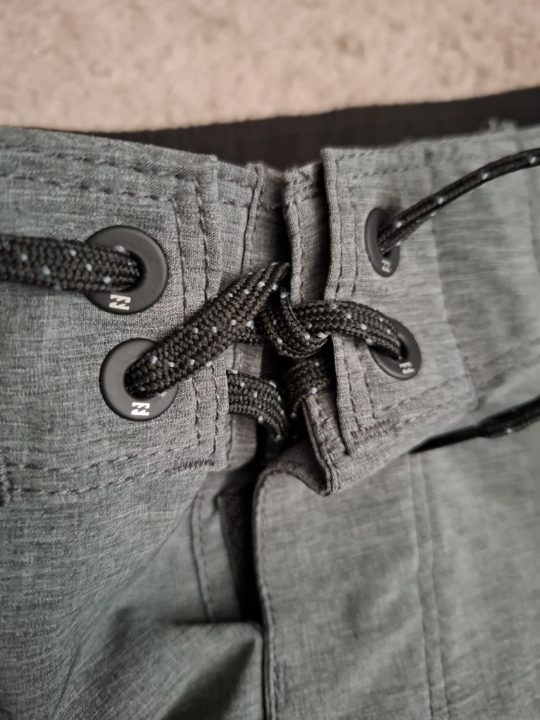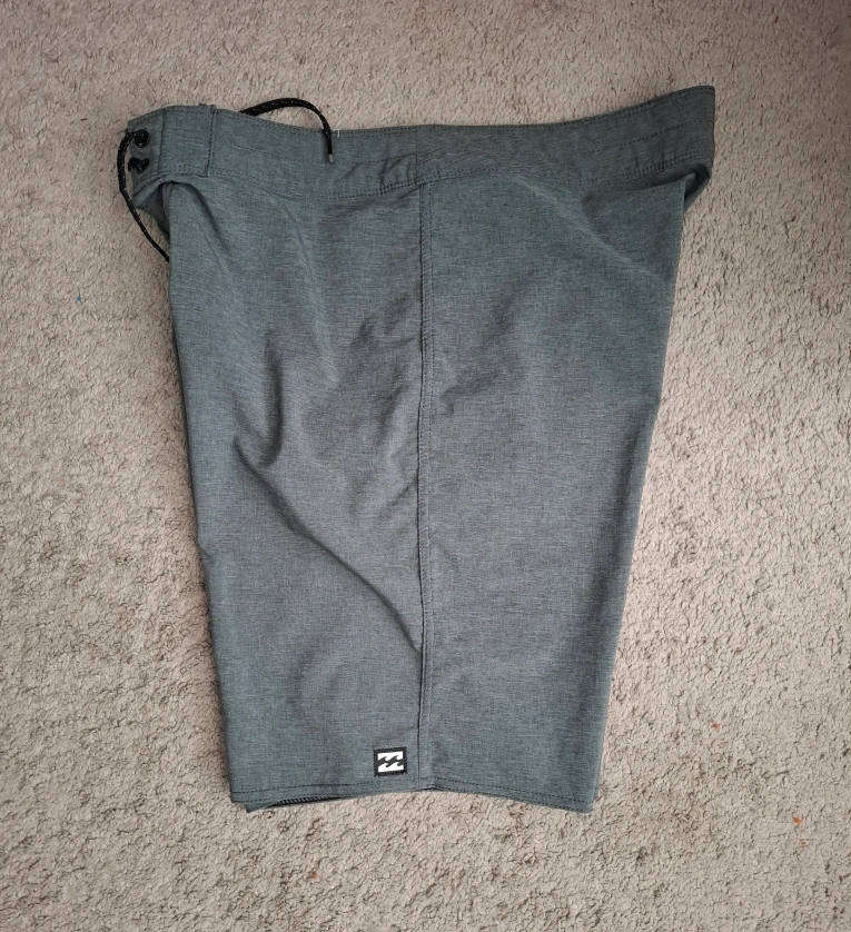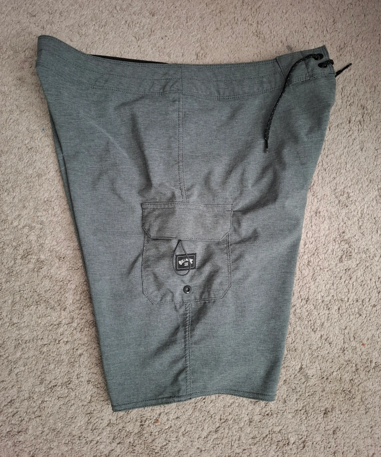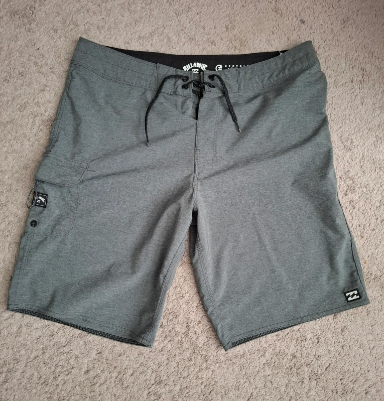 Grey board shorts. Size 32. Recycled material. Drawstring waist. One cargo pocket. Excellent condition.