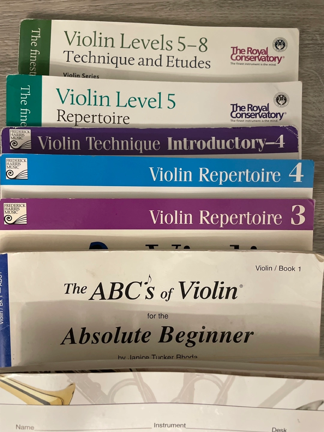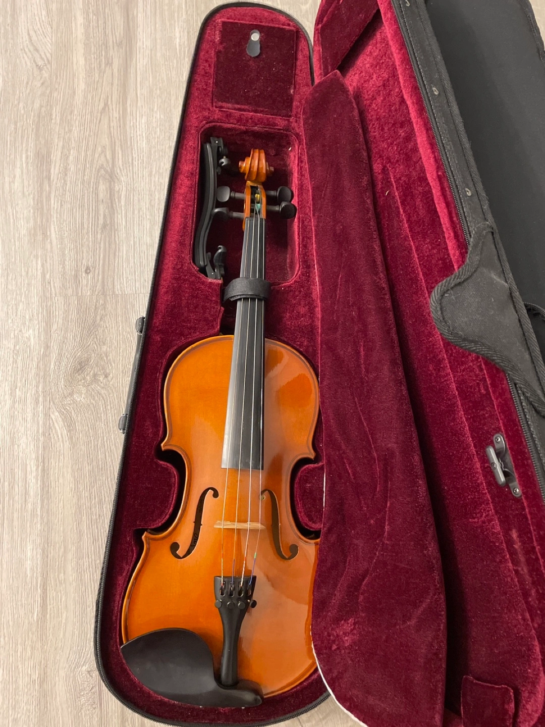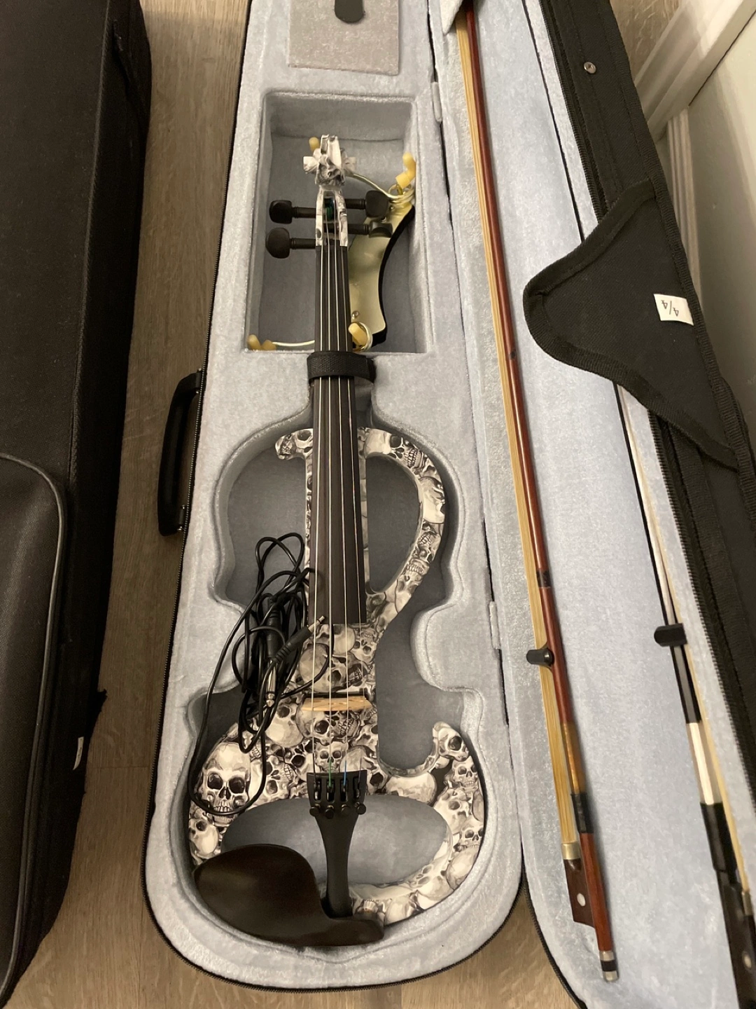 Two violins, one electric with skull design, one acoustic - both 4/4 size. Both include hard cases, bows, and rosin. Also included are two collapsible music stand. Included are violin instruction books. Excellent condition.