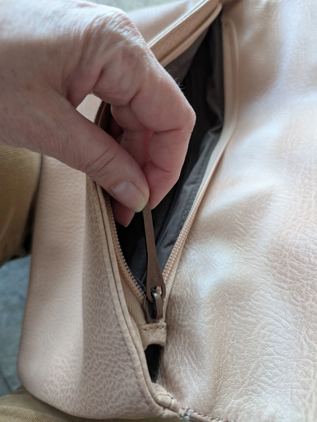 Stylish peachy beige clutch bag. Features a zipper closure and interior pockets. Will pair well with all your spring and summer outfits.