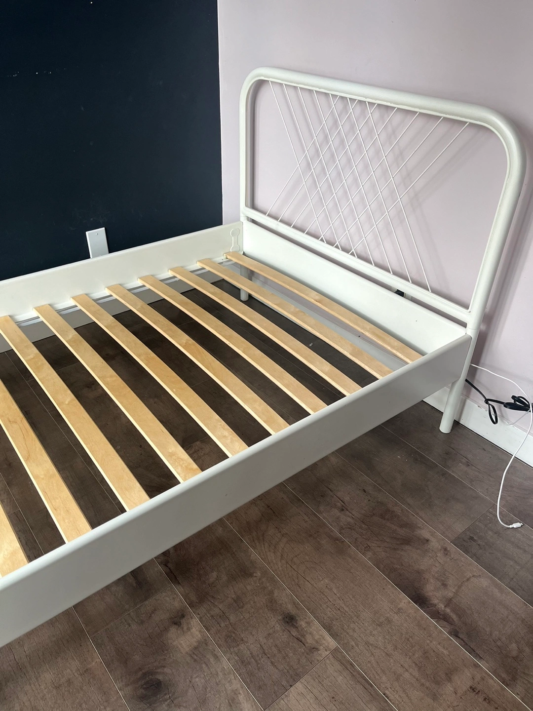 Bed frame was bought at IKEA for $120.00 and the wooden slats for $30.00 which are sold separately. Selling both for $120.00. Fairly used, not damaged at all. Comes with all parts needed for assembly.