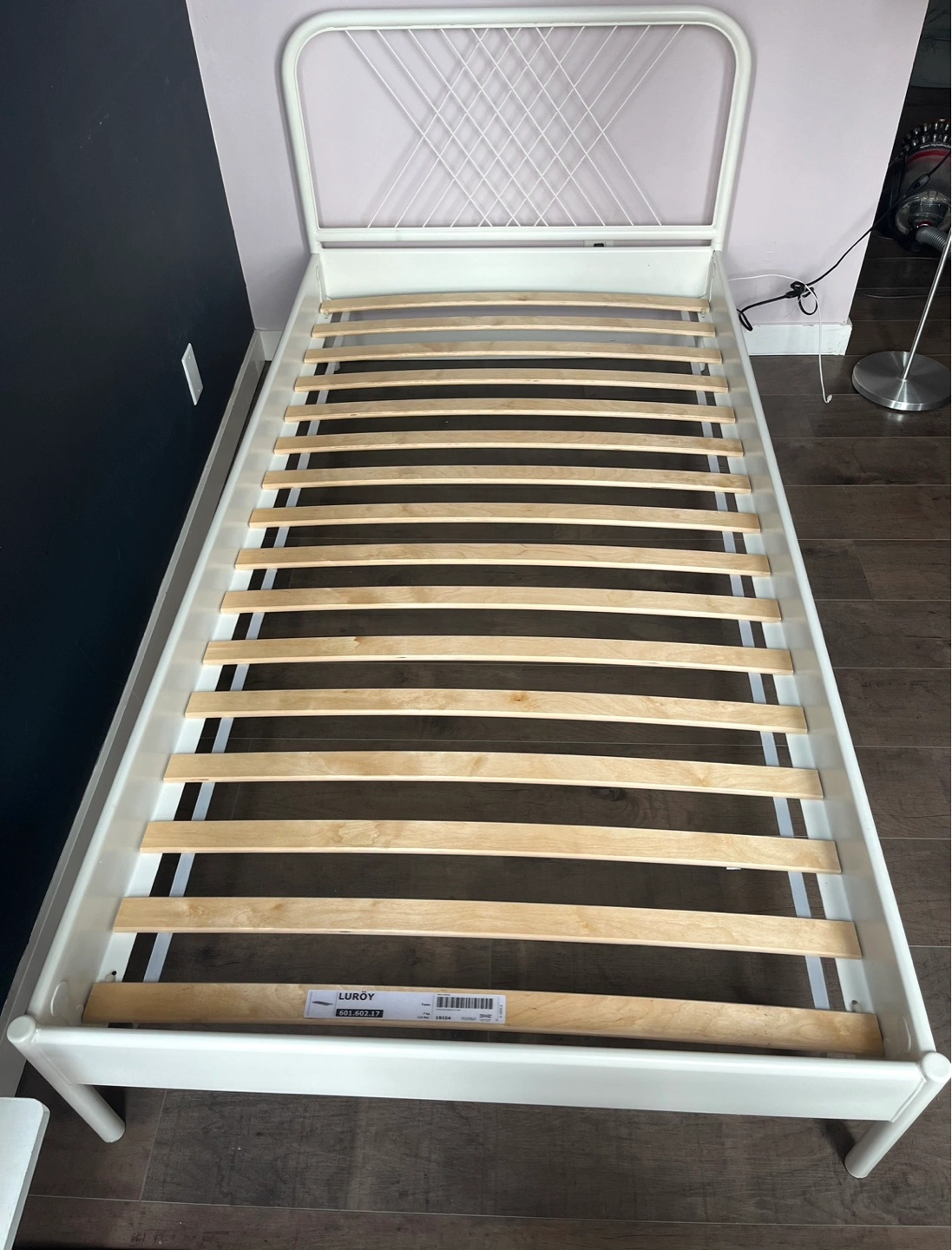 White metal twin bed frame. Includes slatted base. Good condition. Minimal assembly required.