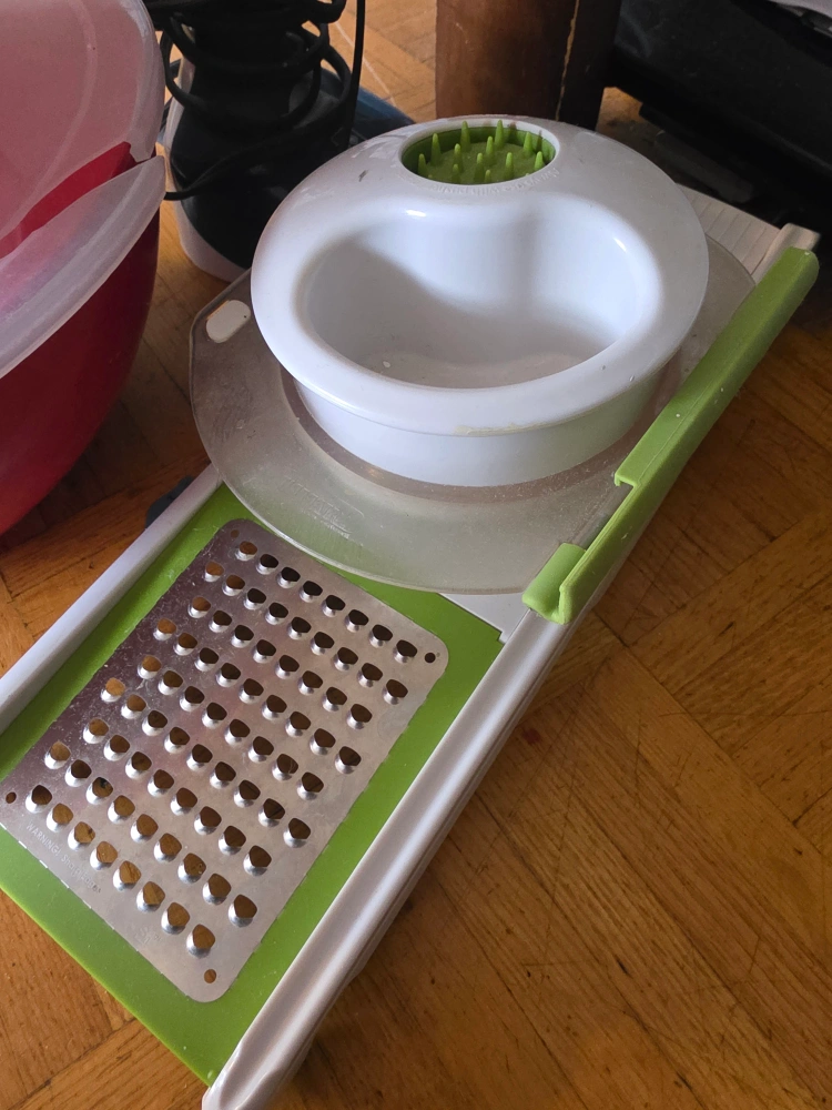 Vegetable grater with attached container. Multiple grating surfaces. Green and white plastic. Compact design.