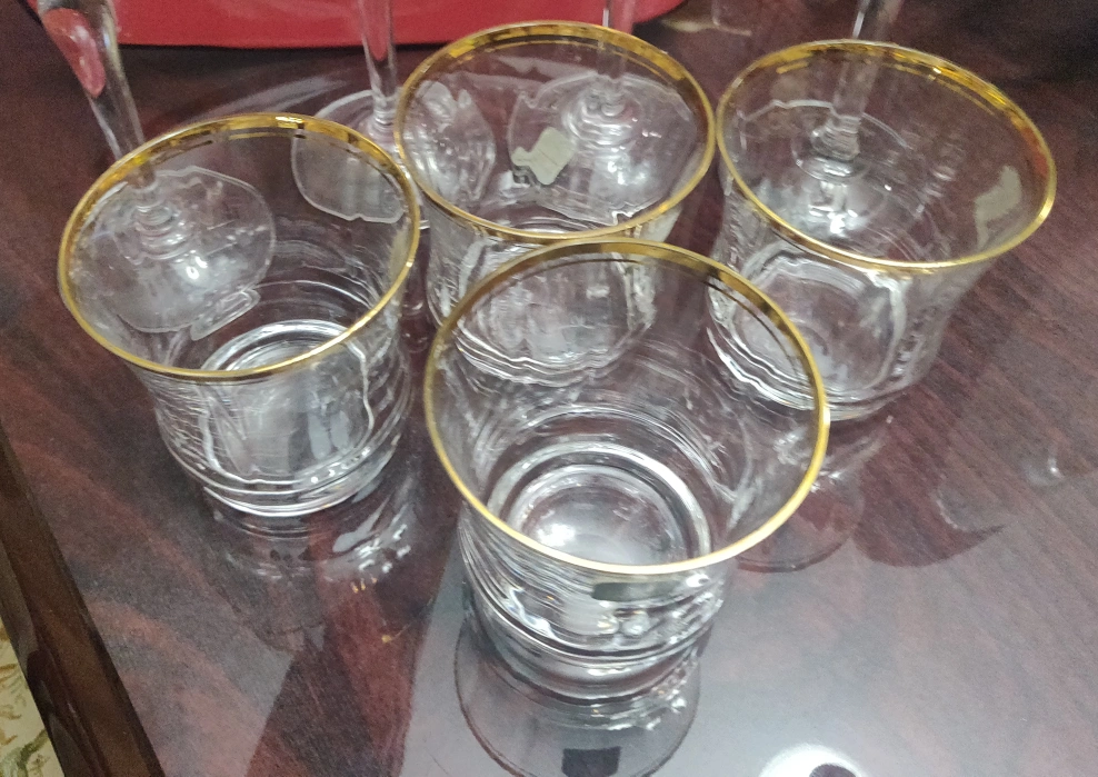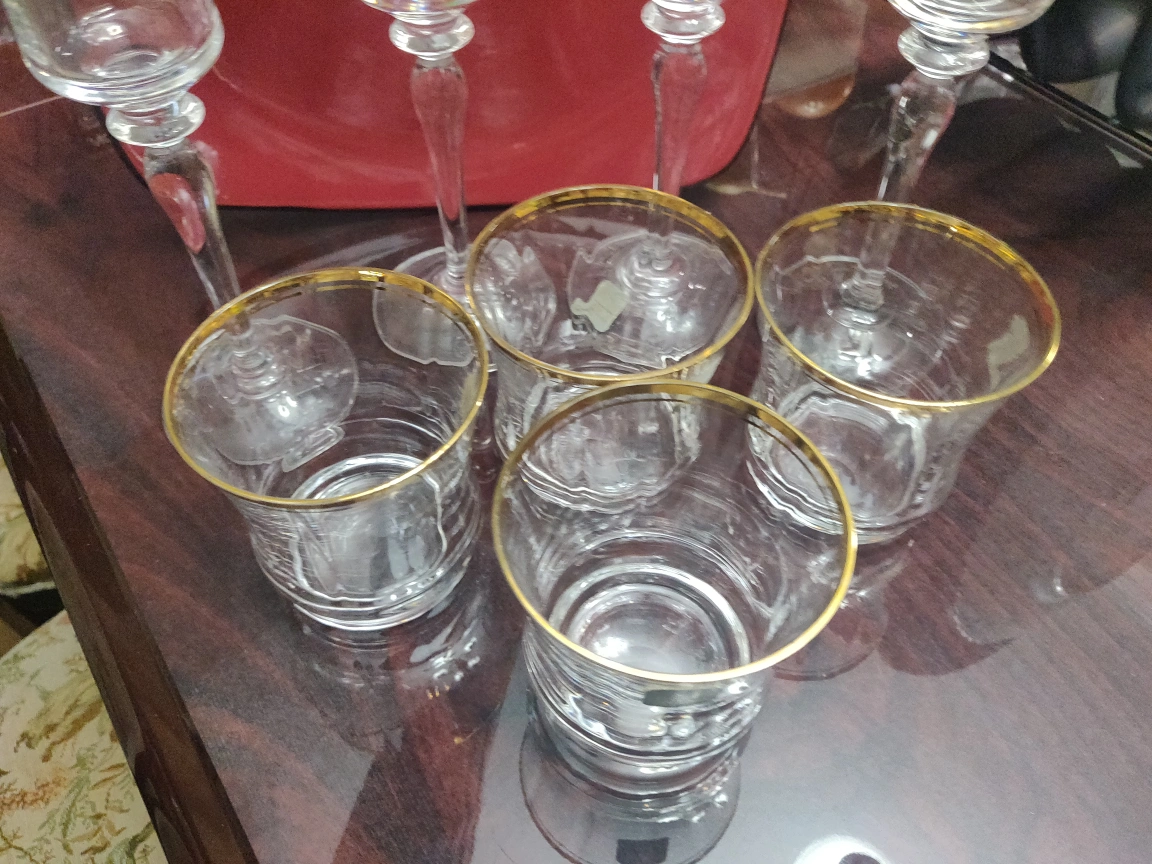 While often called whiskey glasses, these exquisite, hand-blown crystal glasses are in fact water or wine goblets. The distinctive wafer stem and elegant bowl are complemented by a bright gold band and verge, adding a touch of timeless style.