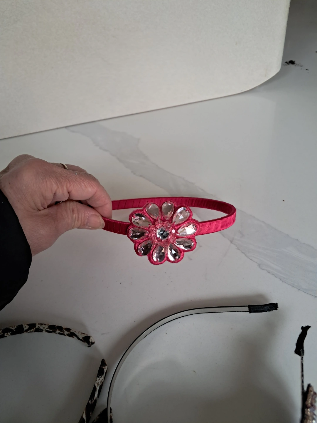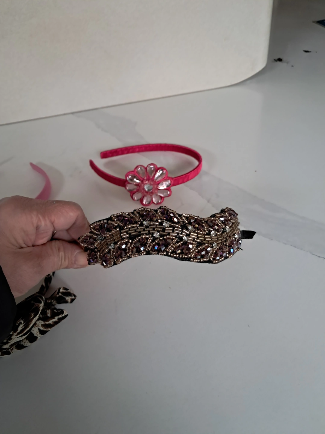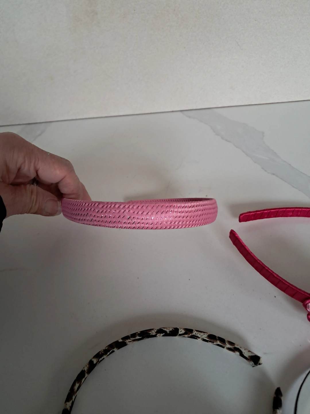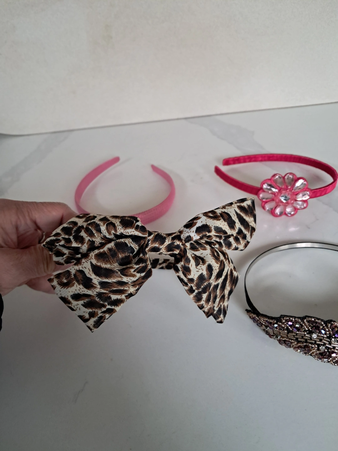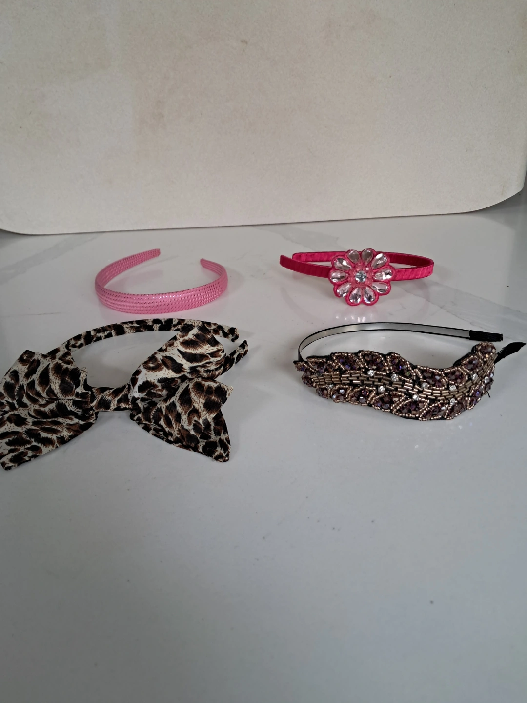 Bundle of four girls' headbands. Pink headband with textured surface. Pink headband with embellished flower. Leopard print bow headband. Beaded headband with purple and gold accents. Great for everyday wear or special occasions.