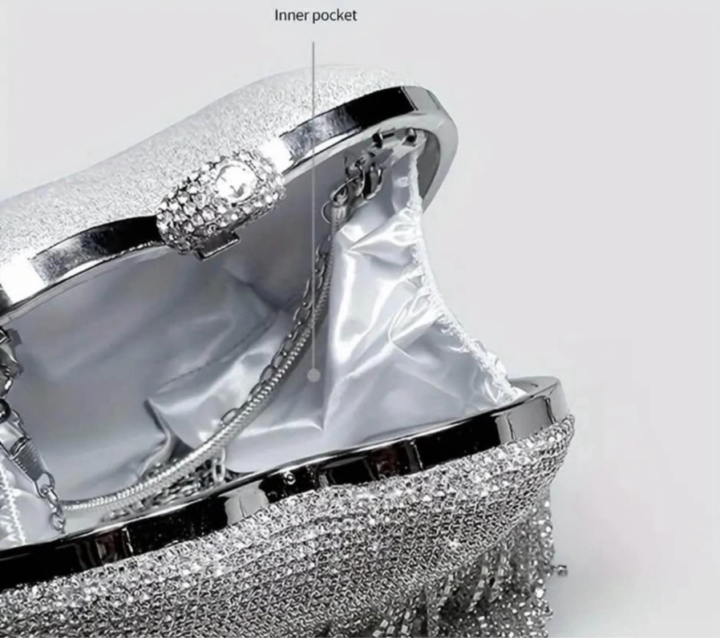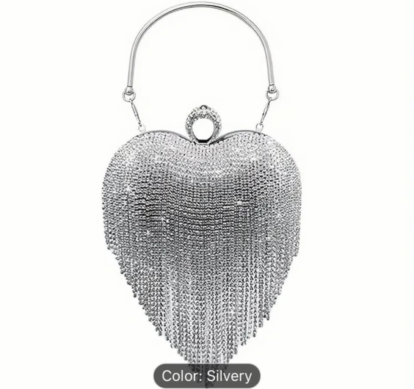 Rhinestone Heart-Shaped Clutch Bag with Fringe