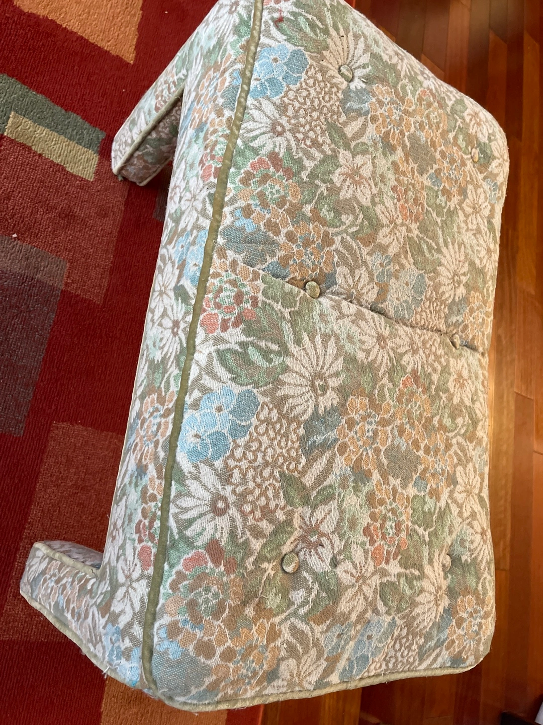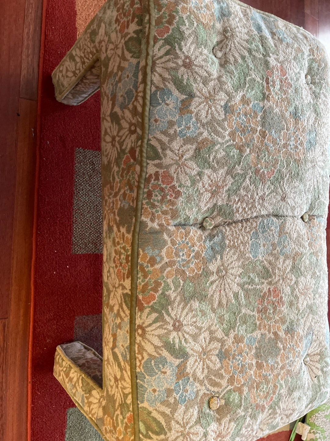 Small vintage ottoman. Floral patterned upholstery. Green, beige, and blue tones.