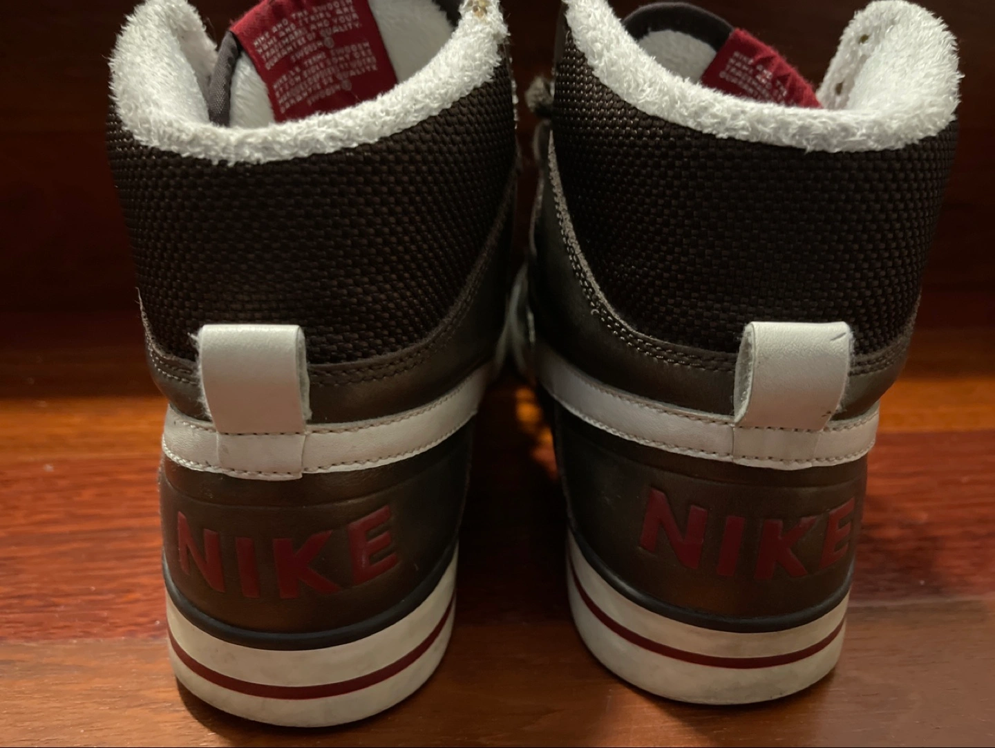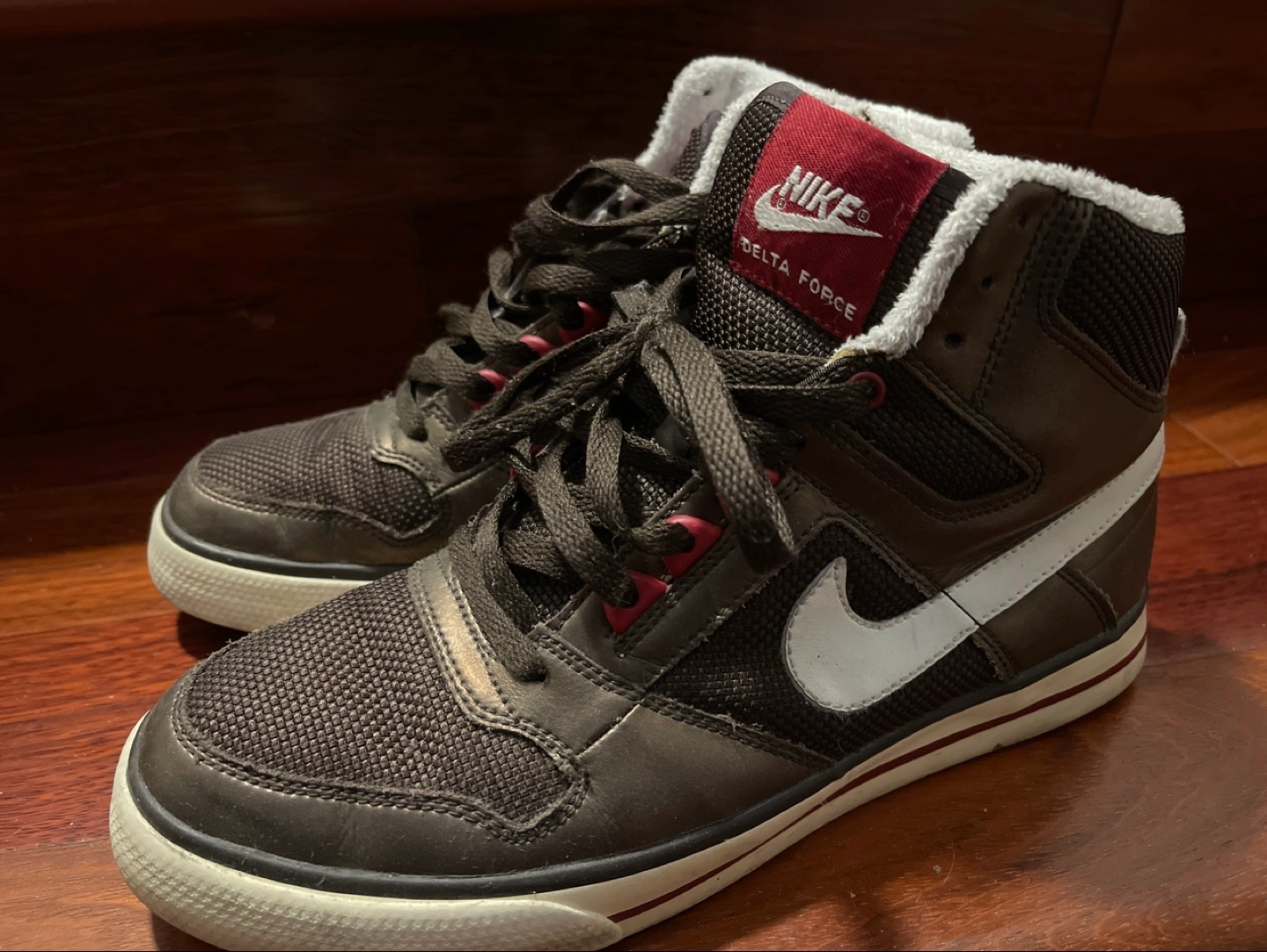 Nike Delta Force high top sneakers. Brown leather and mesh upper. Warm fuzzy interior lining. Casual and versatile style for anyone.