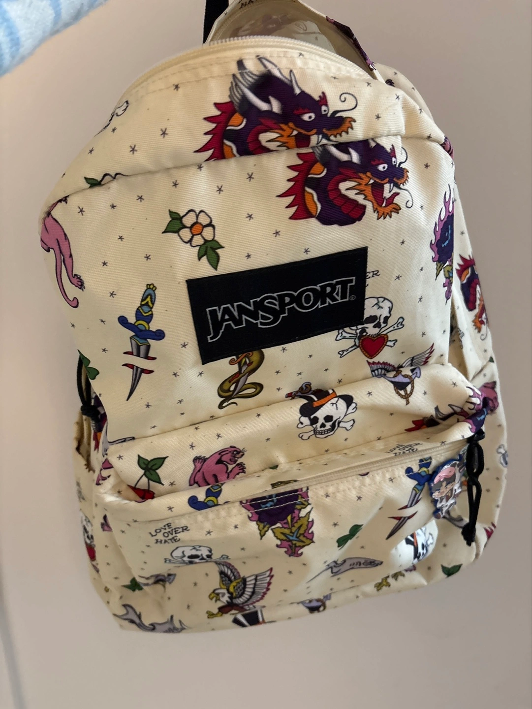 Cream coloured backpack. Features a tattoo print design. Multiple pockets. Adjustable straps.