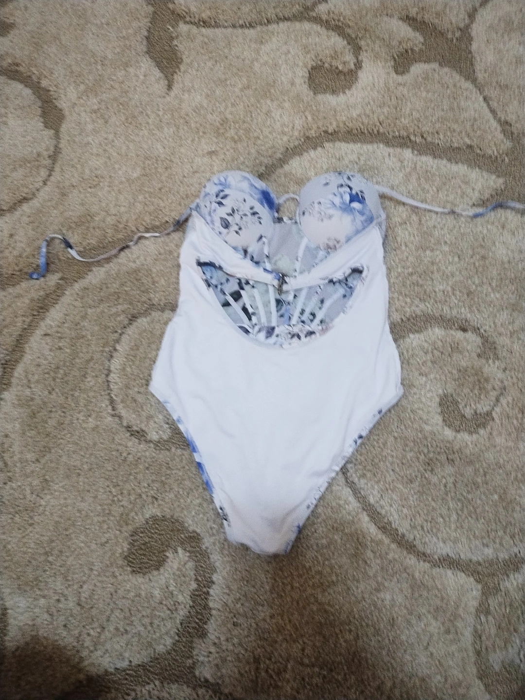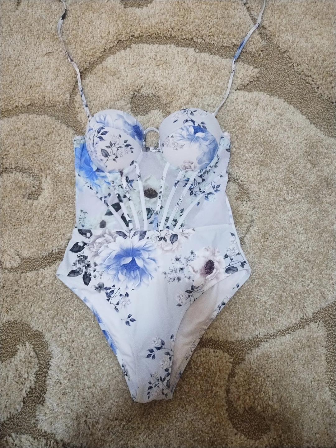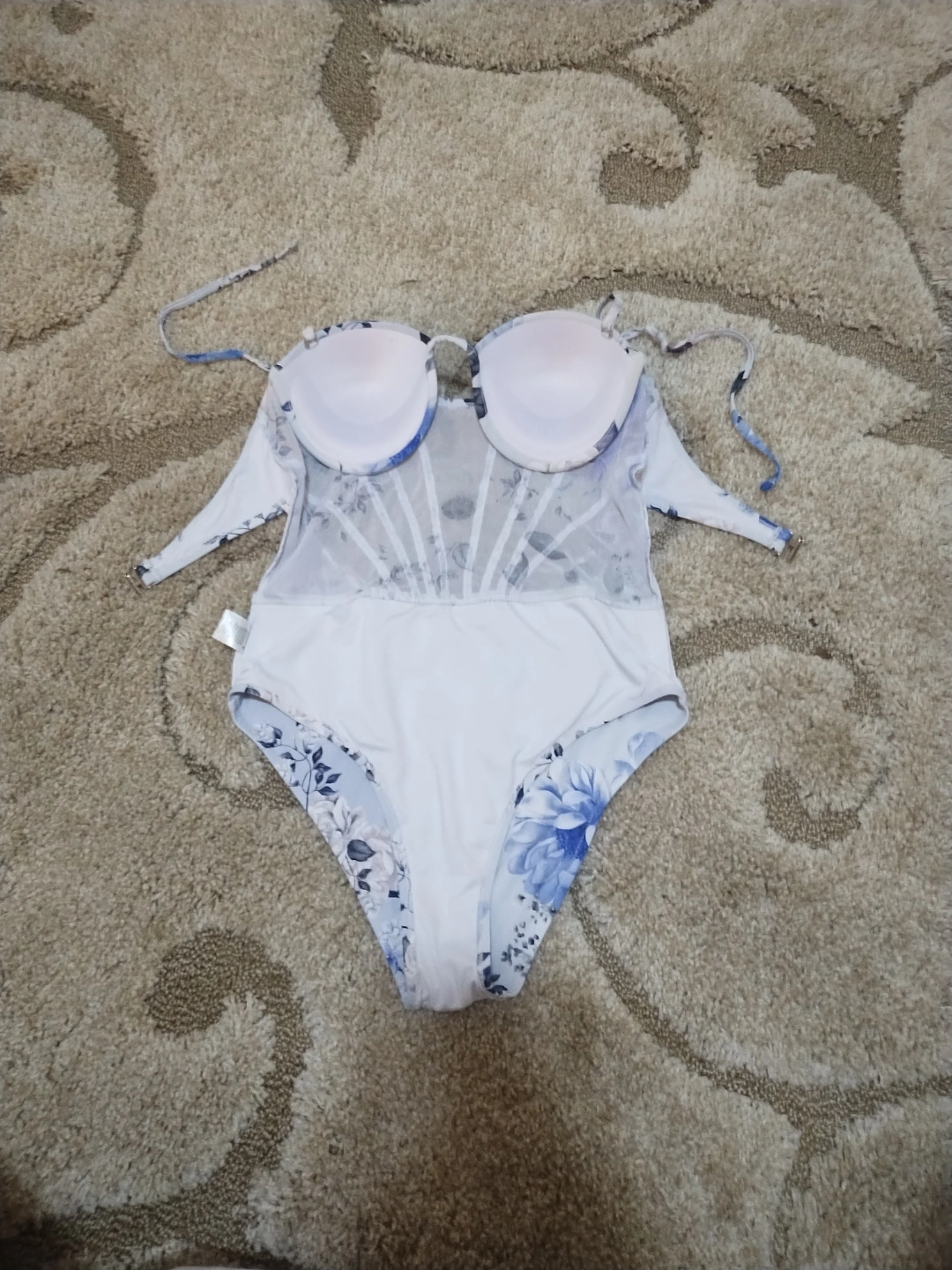 Beautiful floral print. Size large. Mesh corset detailing. Underwire cups. Adjustable straps. Excellent condition.
