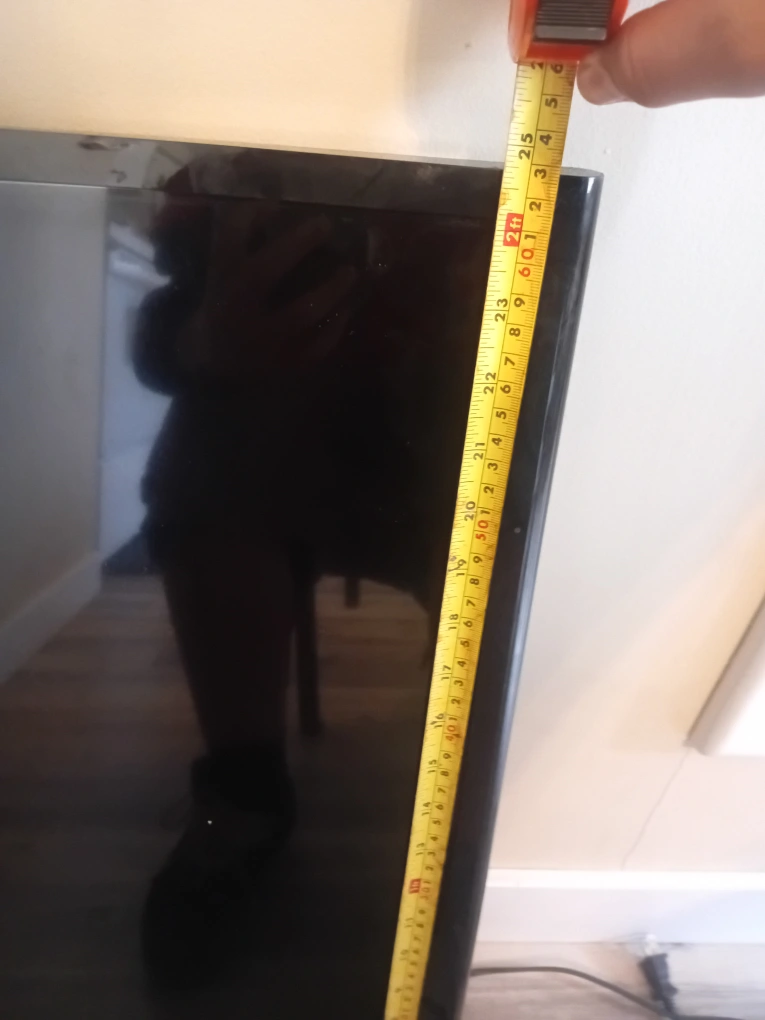 43 inch Samsung Smart TV. Screen has 5 lighter dots and white line at top (as shown in picture), no stands, power button is hard to use, includes power cord