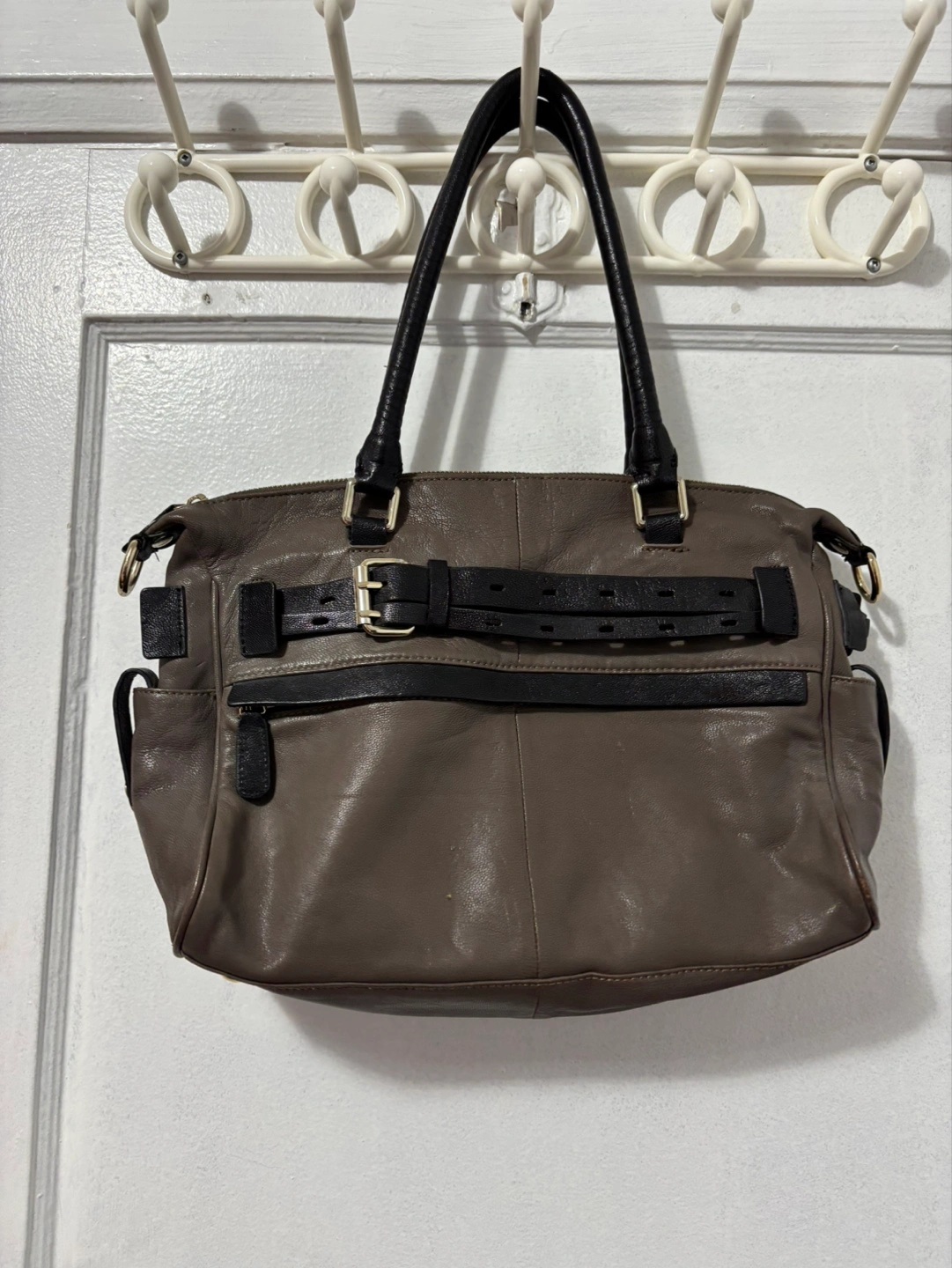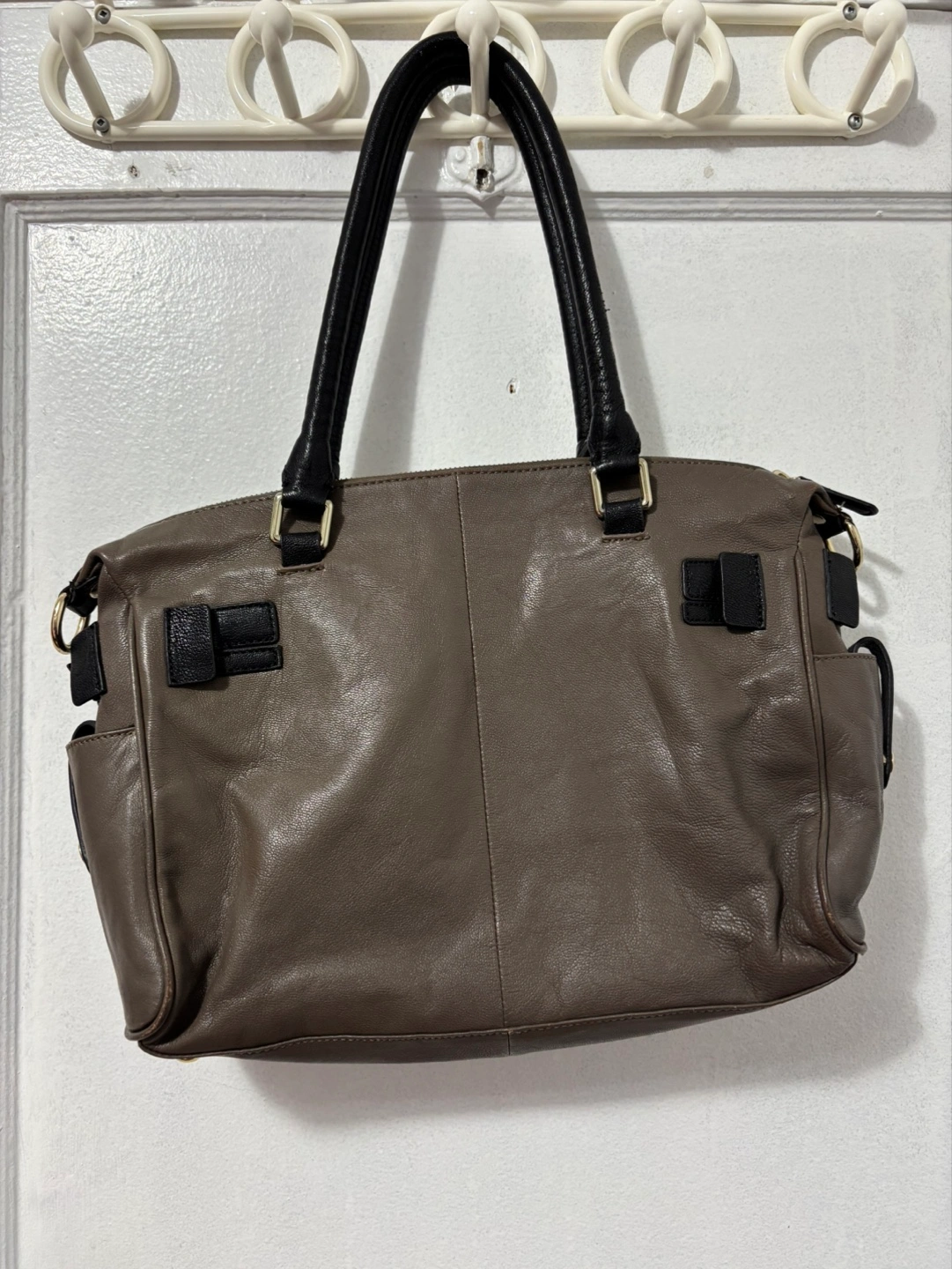 Beautiful grey leather handbag. Features black leather trim and handles. Gold-toned hardware. Small side pockets. Top zipper closure. Stylish and functional.