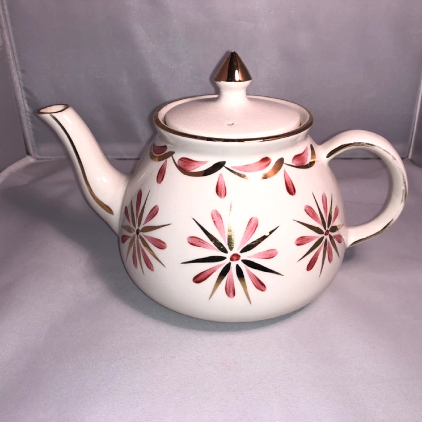 Charming mid-century vintage teapot. Features a pink and gold floral pattern. Cream coloured crackled body. Gold detailing on lid and spout. Made in England by Gibsons of Staffordshire (founded in 1875).