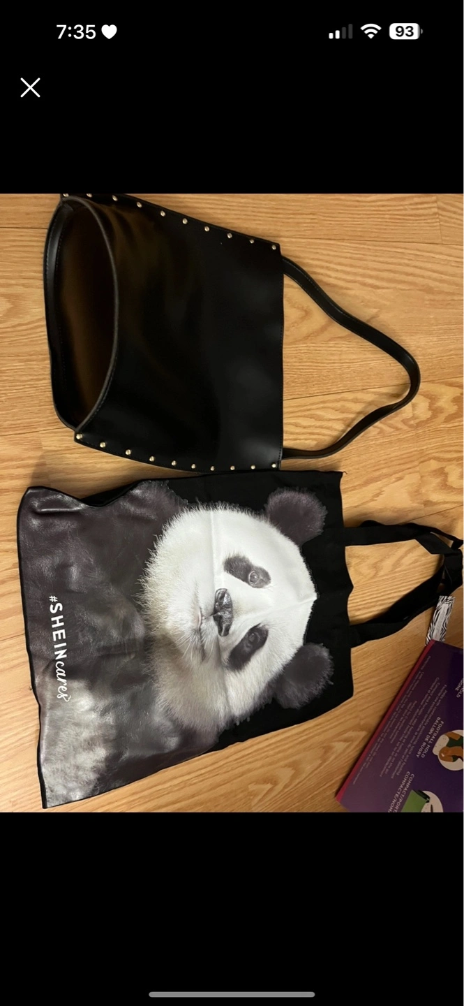 Two bags included. One black shoulder bag with gold studs. One black tote bag featuring a panda graphic and the text #SHEINcares. Great for everyday use.