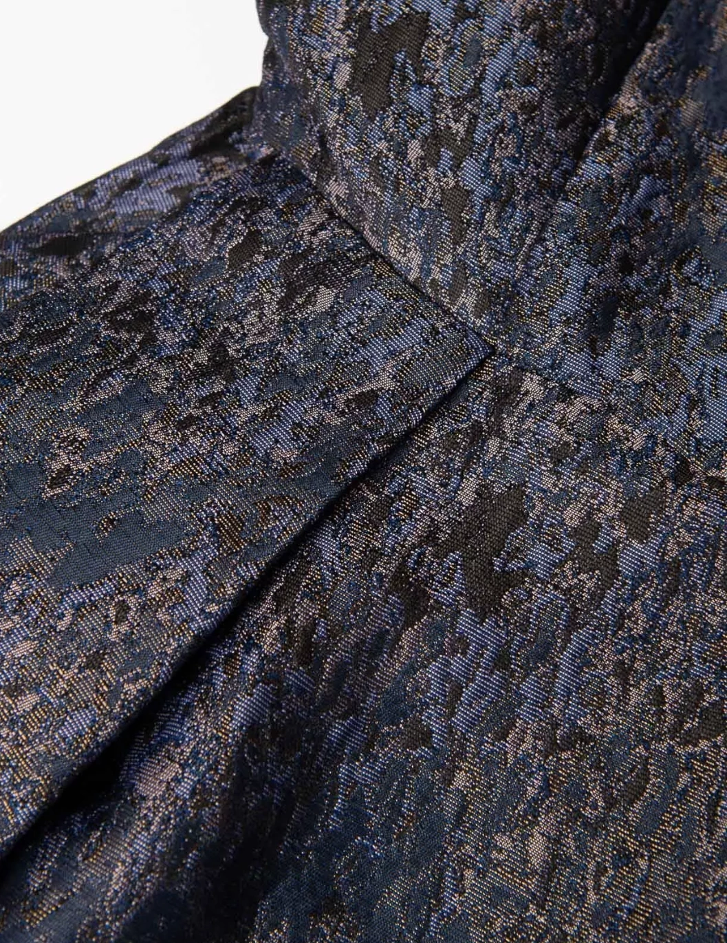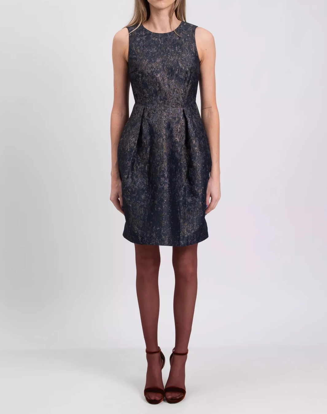 Gorgeous sleeveless mini dress. Blue patterned jacquard fabric. Round neck. Pleated detail. Partially lined. Dry clean only. Brand new. Regular retail price $572