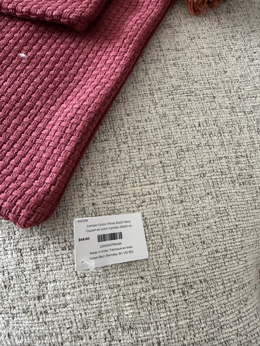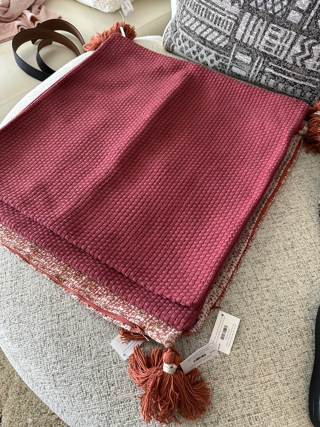 Four Urban Barn pillow covers. One is a solid mauve colour, the other has a textured mauve and cream pattern. One design features tassles. Tags attached. One cover retails for $50+. Take all for $75 OBO