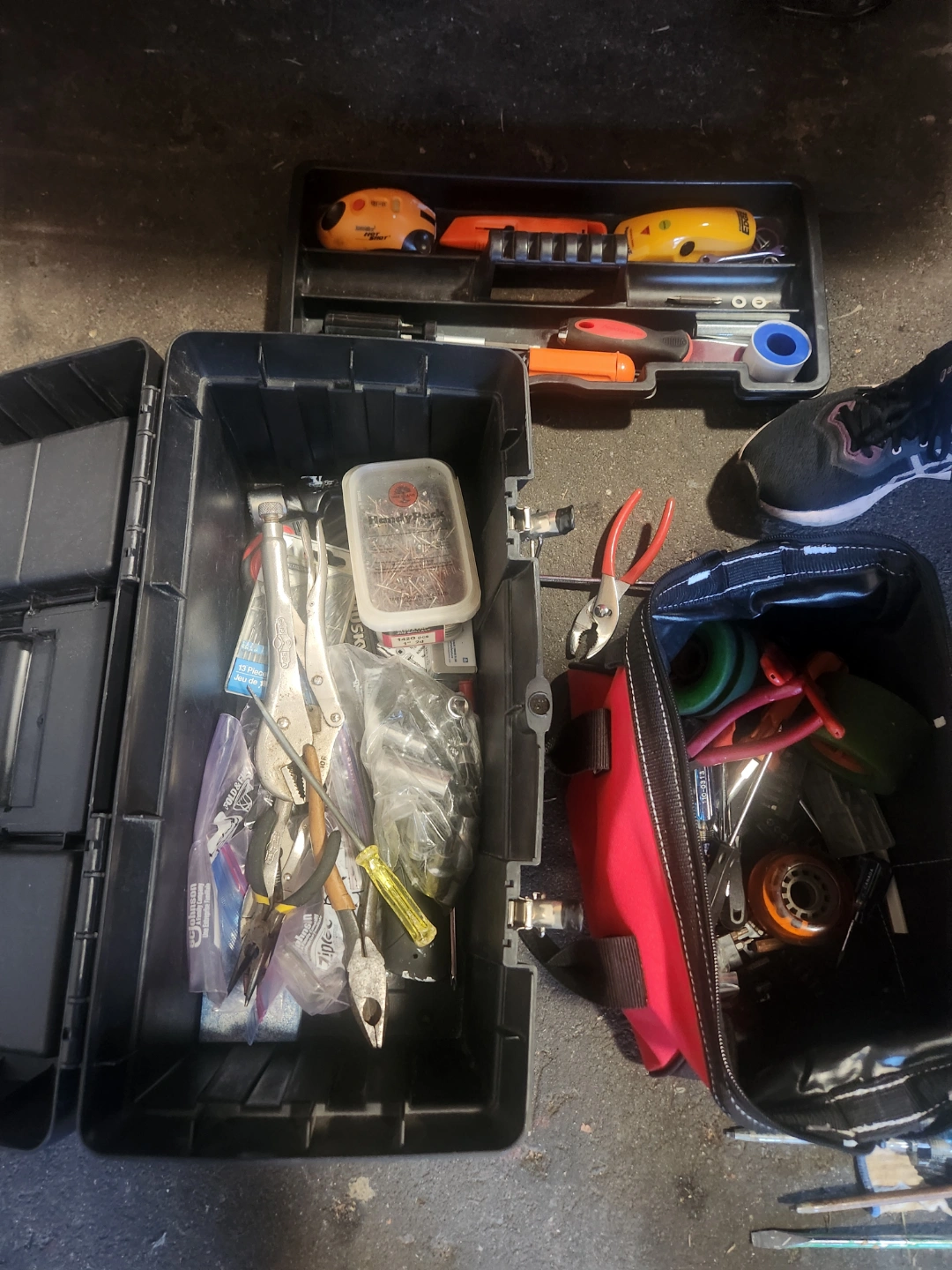 Large black plastic tool box, filled with various hand tools. Includes pliers, screwdrivers, and other small tools. Also a smaller red tool bag with additional tools. Great for DIY projects or a mechanic.