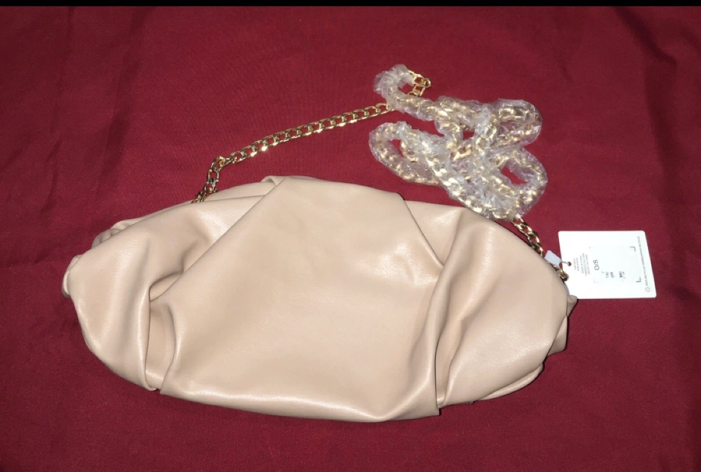 Cream coloured shoulder bag. Features a gold chain strap and zipper closure. New with tags.