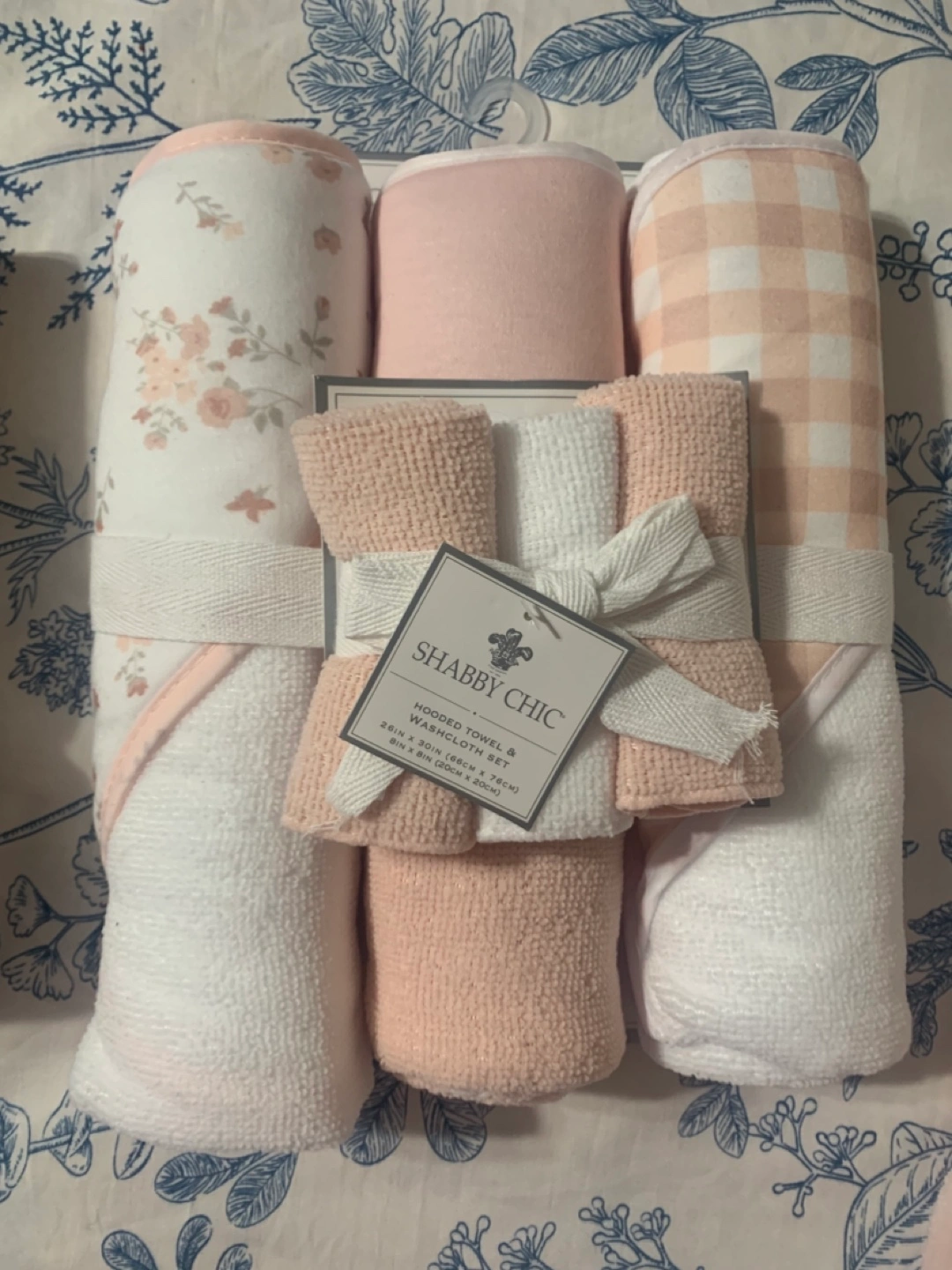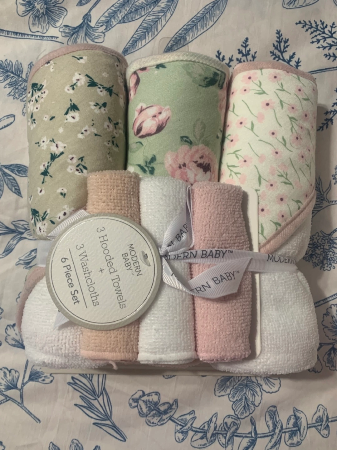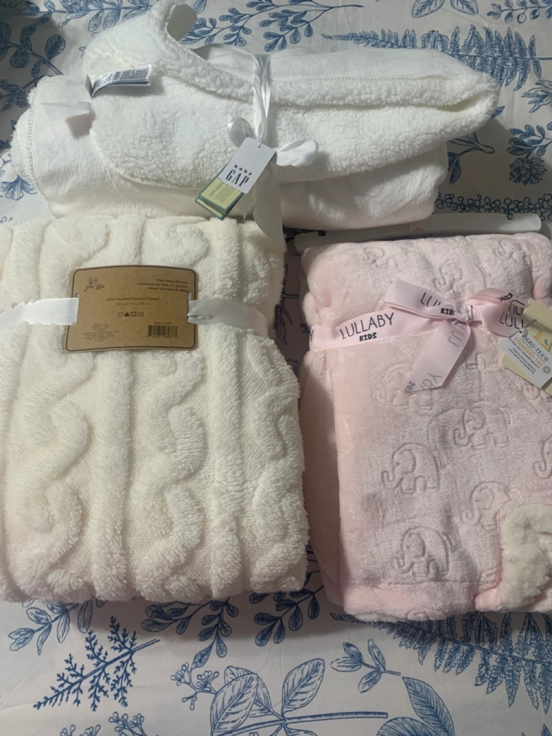 New baby items. Includes three plush blankets from GAP and Winners. Also, two sets of hooded towels and washcloths, one in floral patterns and another in pink and white. $10 each or $45 for the whole bundle.