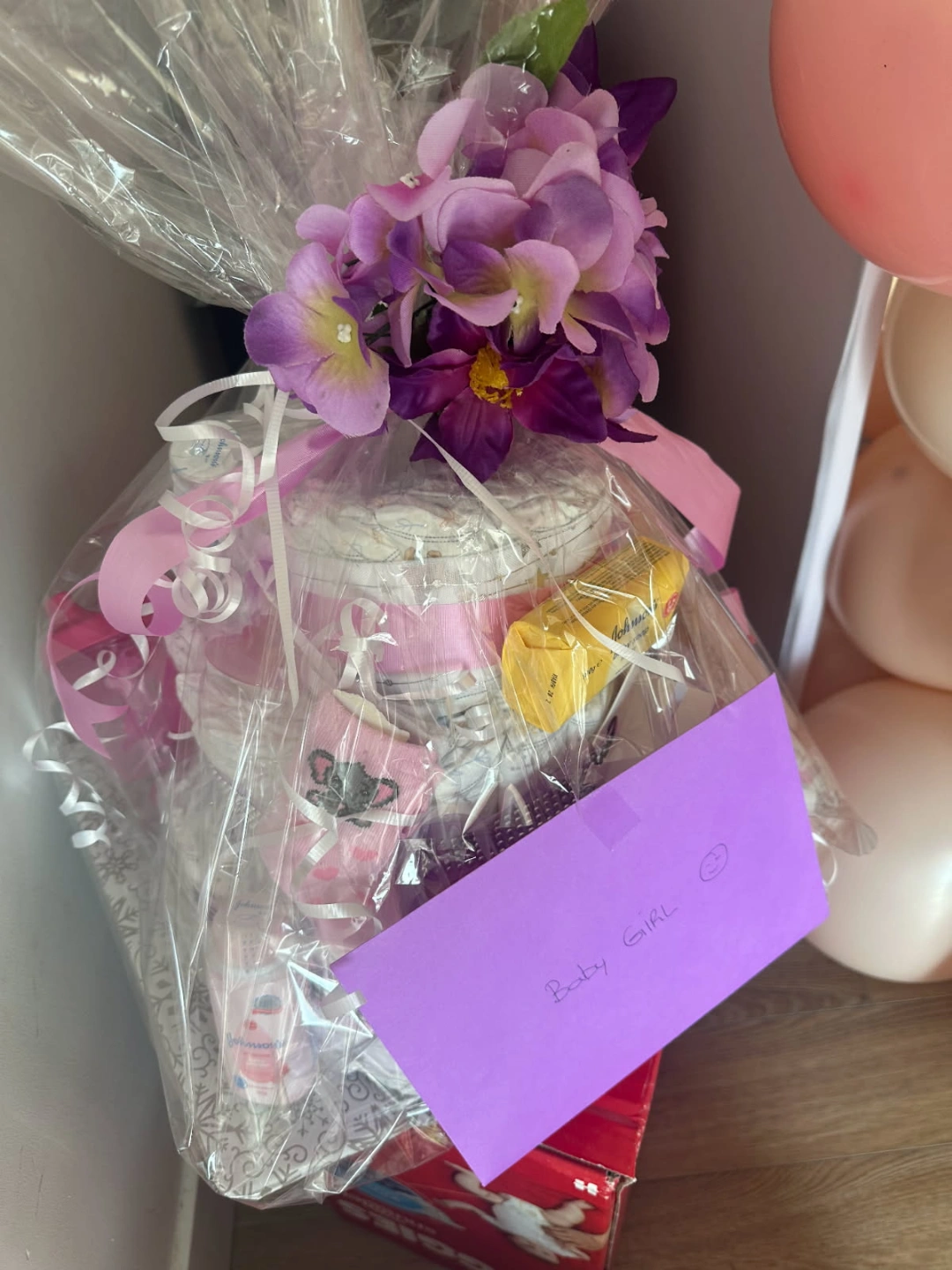 Adorable baby girl gift basket. Includes diapers, baby socks, and other baby items. Perfect for a baby shower or new parent gift. Wrapped in cellophane with flowers.
