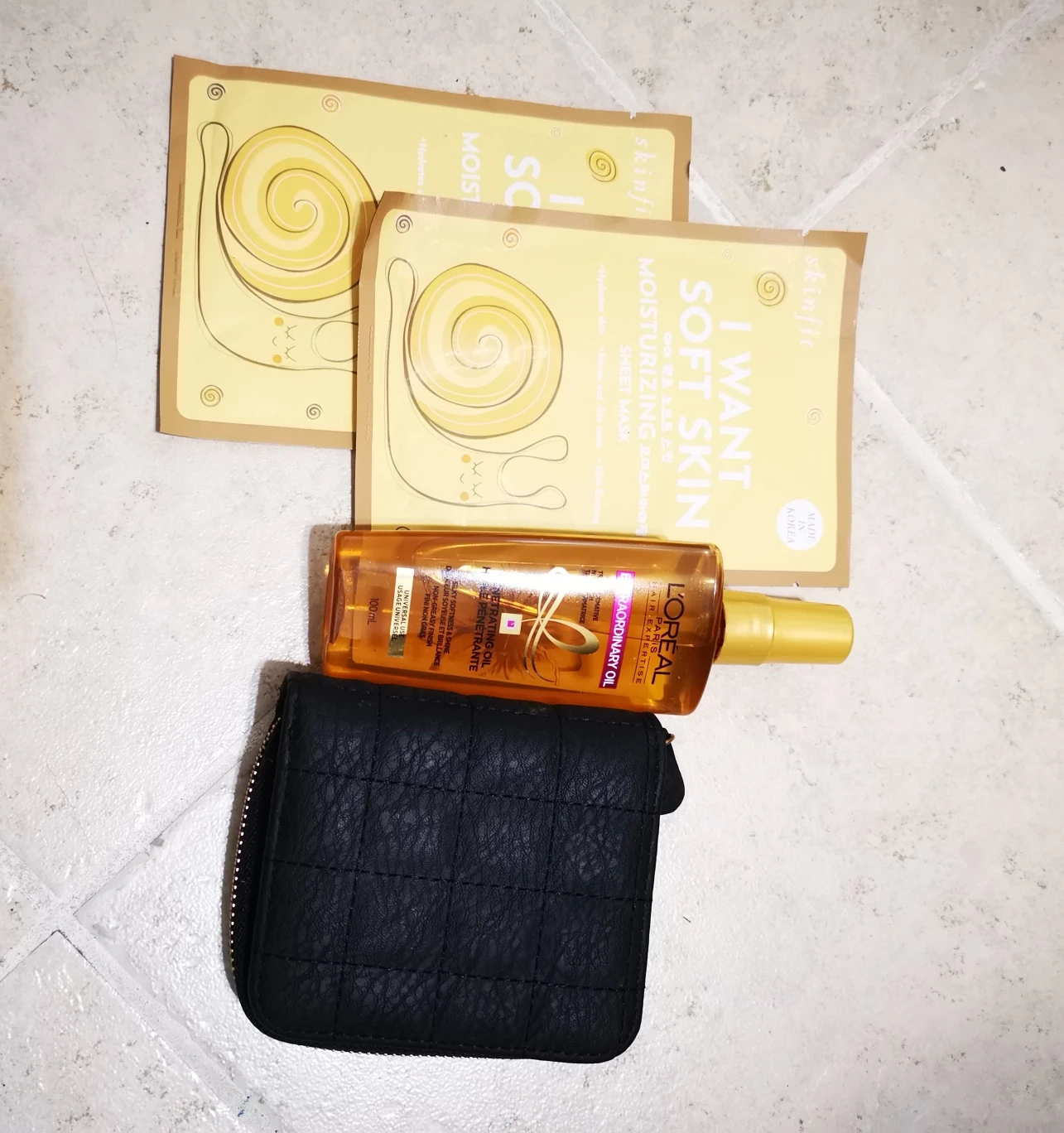Bundle includes two Skinfit snail sheet masks and a bottle of L'Oréal Paris Extraordinary Oil. Black quilted wallet also included.