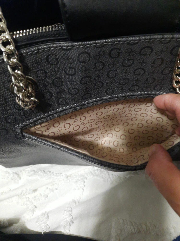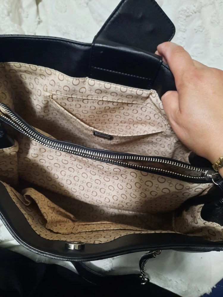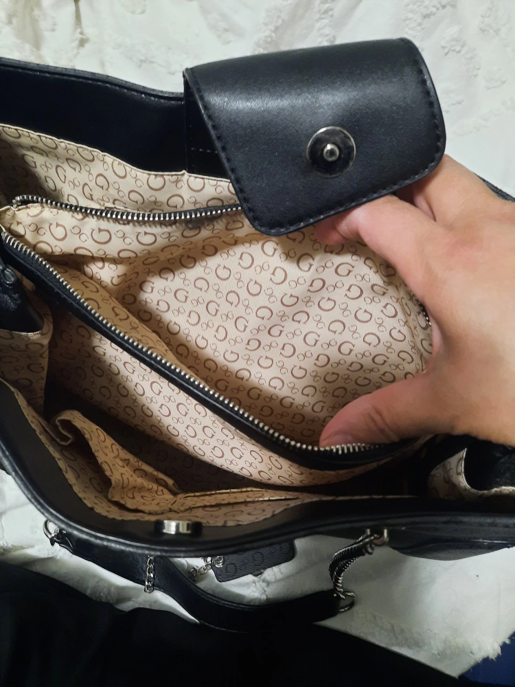 Large black tote bag. Features a silver chain strap and Guess logo print. Zipper closure. Excellent for everyday use. very good condition