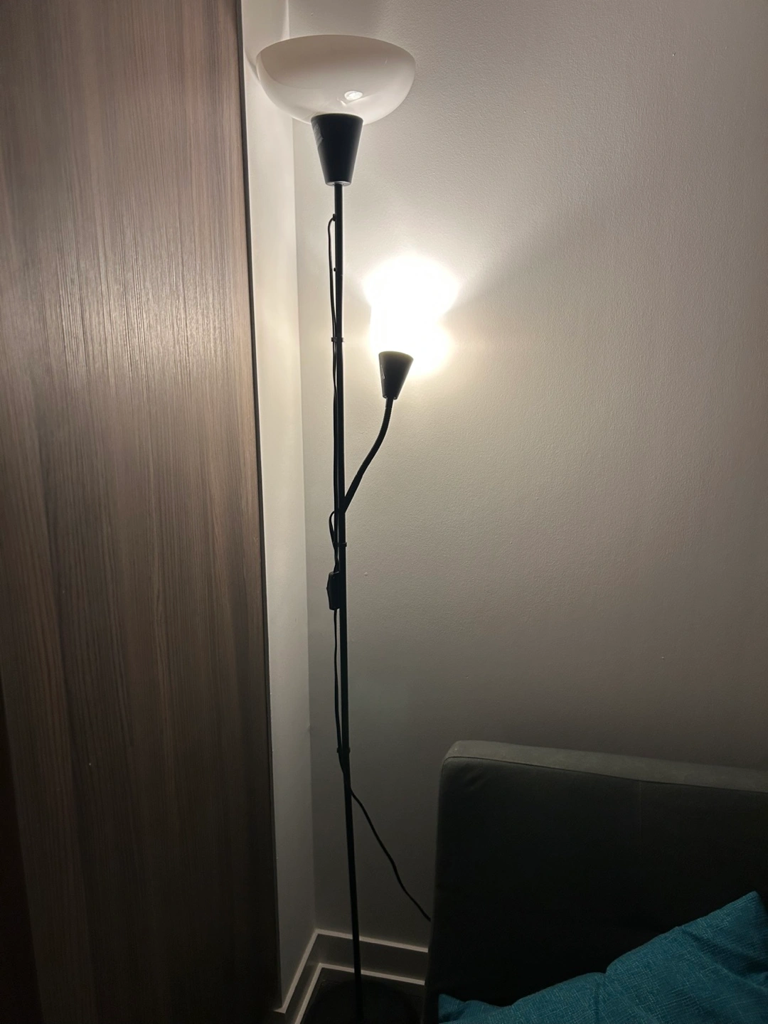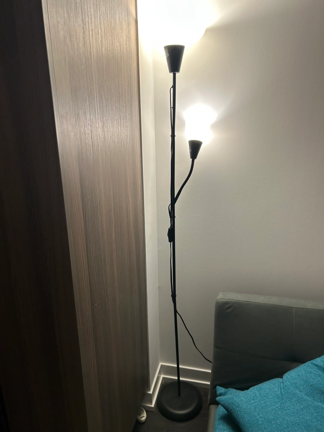 Black floor lamp, two lights. Great condition, comes with installed lightbulbs.