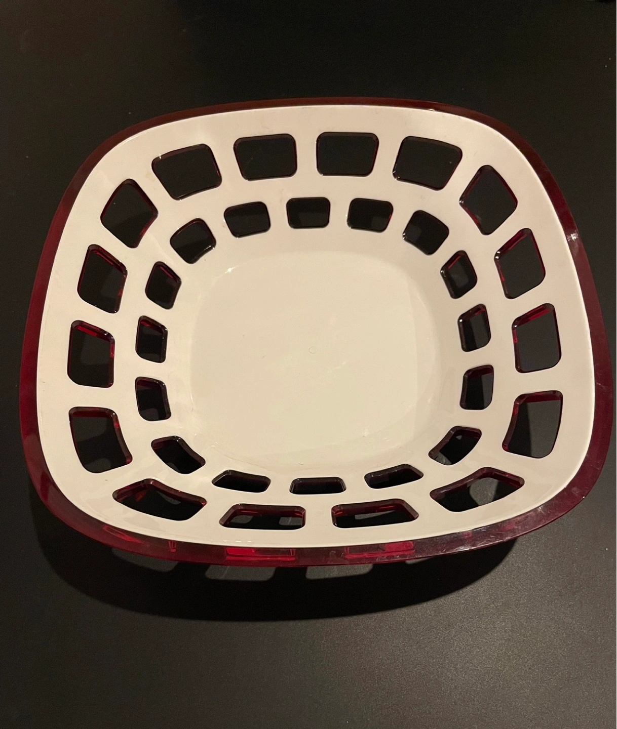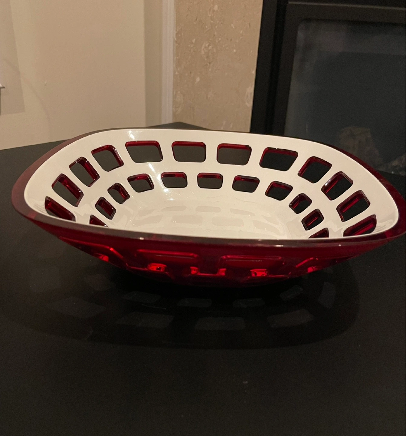 Unique and versatile red bowl. Cut-out design. White interior. Made in Italy. Great for fruit or bread, or as a decorative piece.