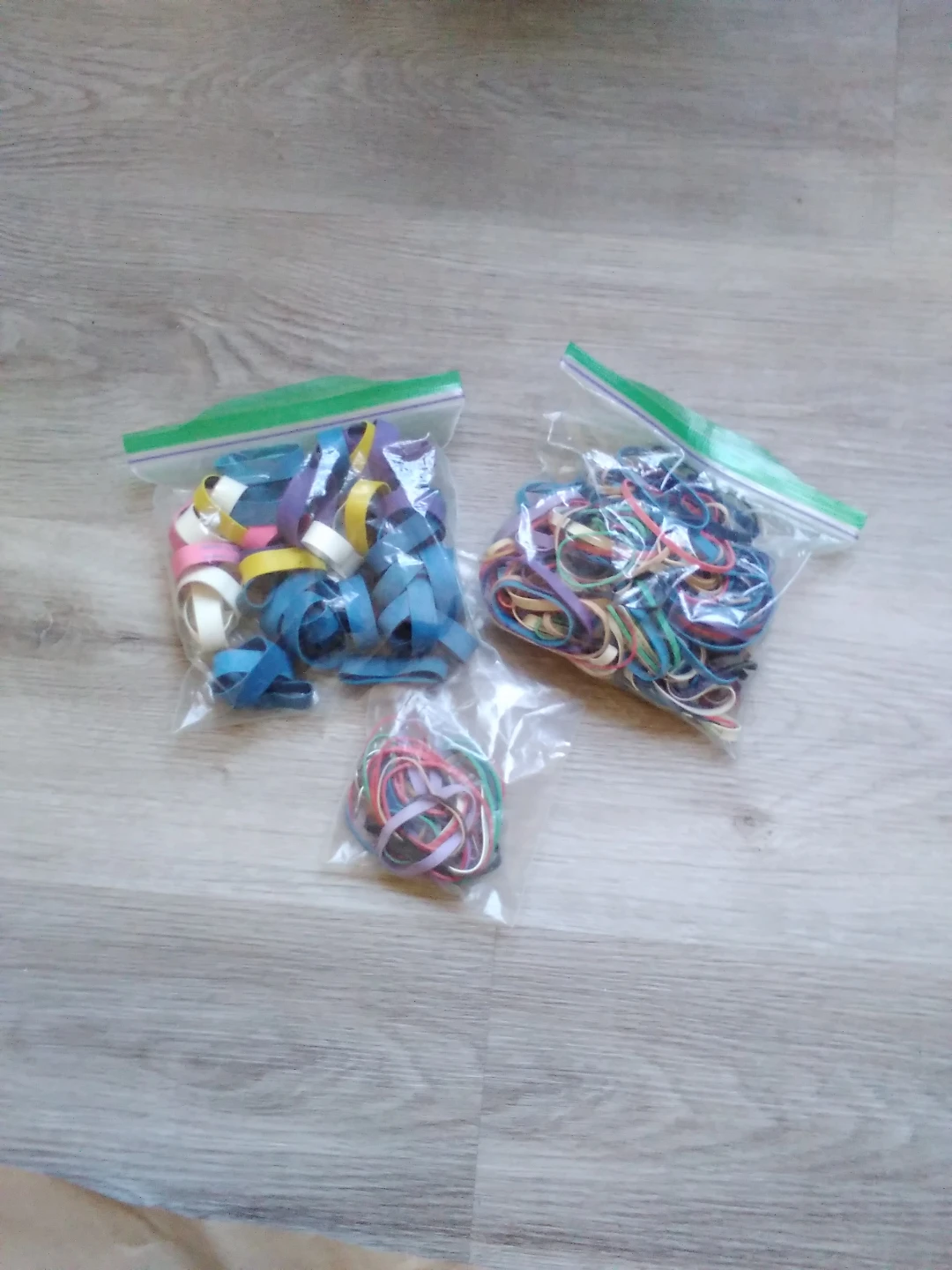 Colourful rubber bands of various sizes. One bag is filled with wide small ones, you know how broccoli is.. Perfect for organizing or crafting.