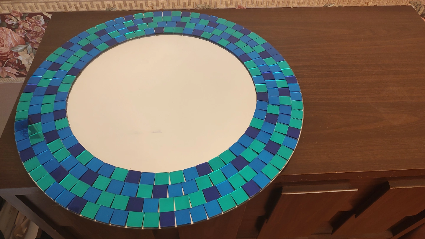 Beautiful round mirror. Mosaic tile frame. Teal and blue colours. Adds a touch of elegance to any room. Perfect for a bathroom, bedroom, or entryway.