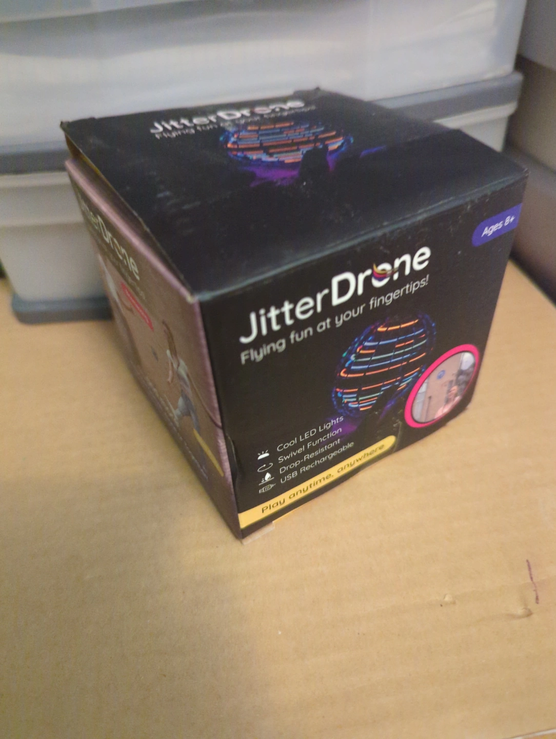 Flying drone toy. Features cool LED lights, swivel function, drop resistant, and USB rechargeable. Fun for ages 8+ *USB missing*