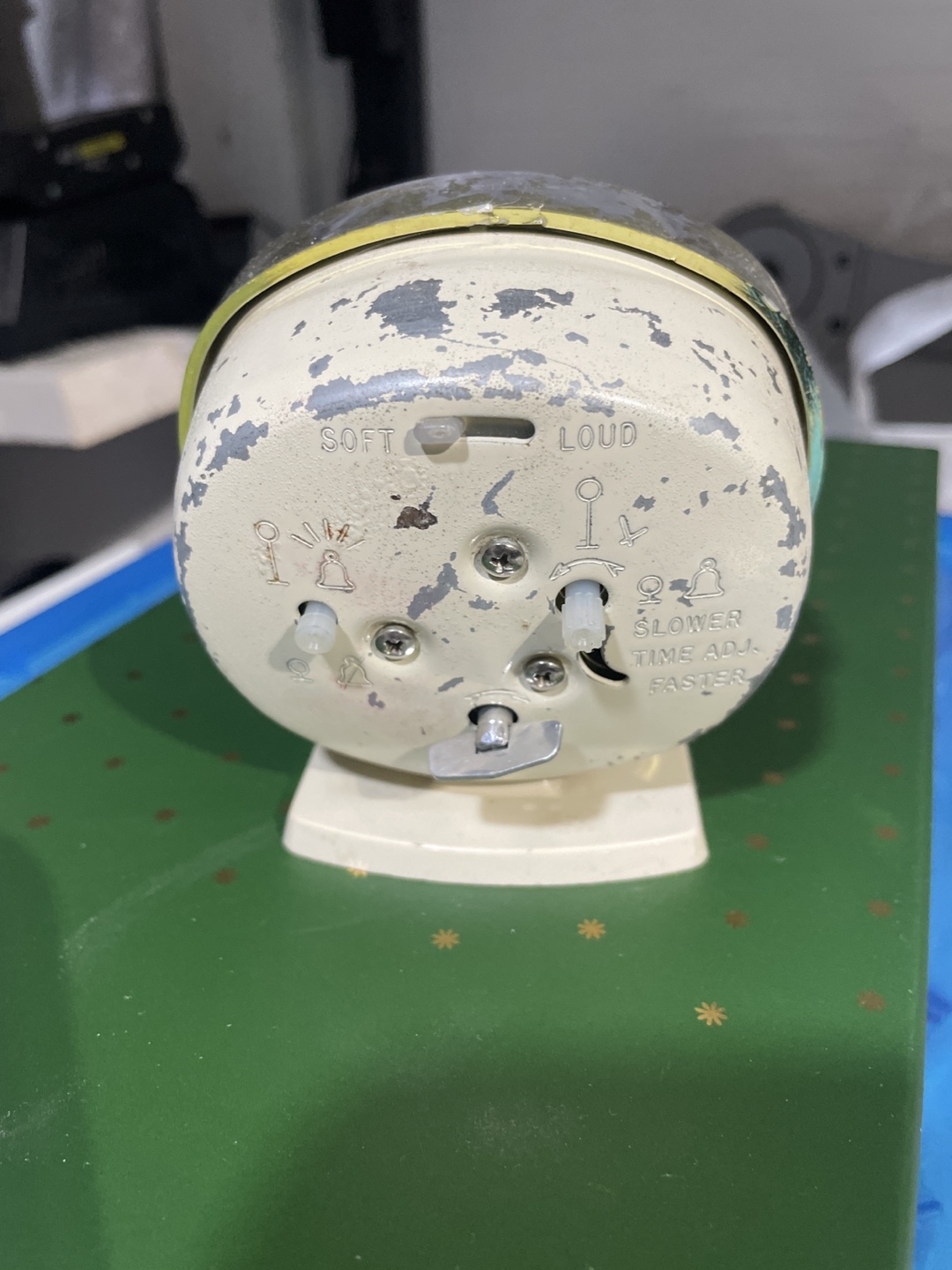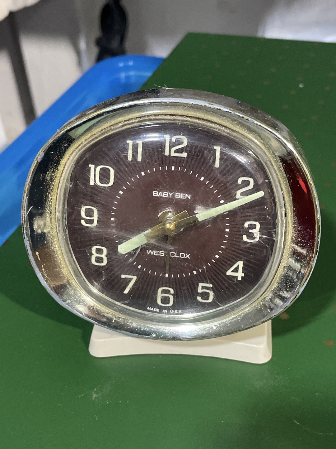 Vintage Baby Ben alarm clock. Made in the USA. Features a dark brown face, chrome bezel, and off-white base. Shows signs of age and wear. Winding coil to operate, no battery operation.