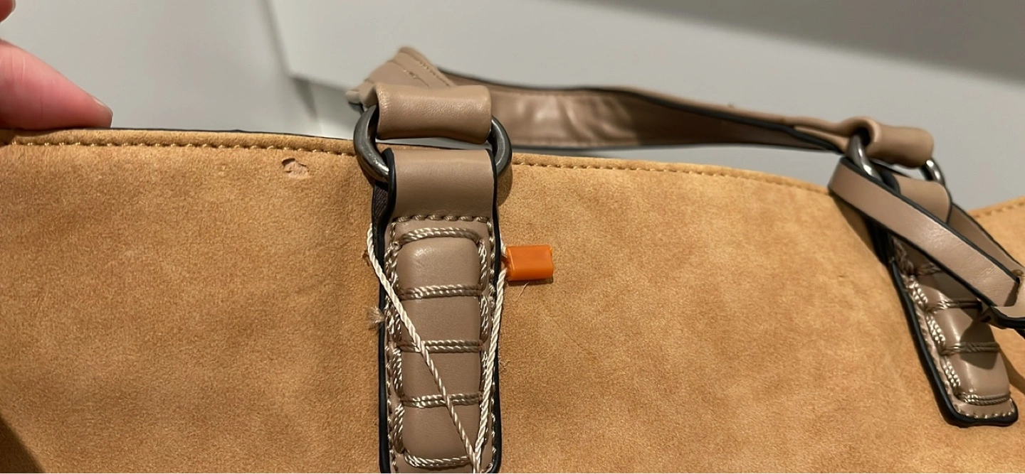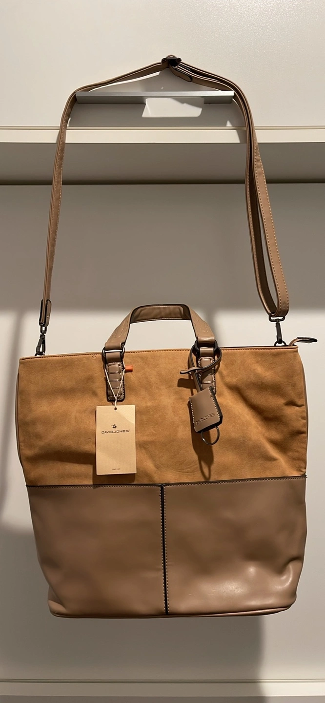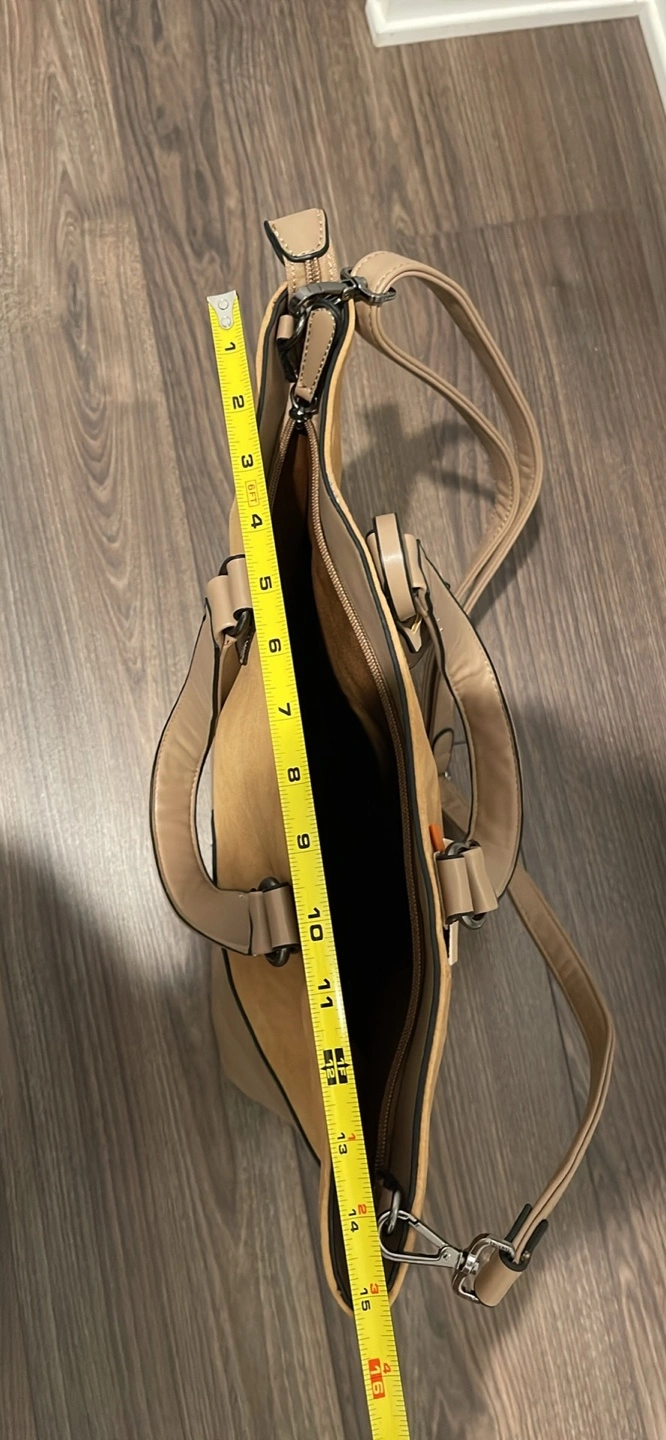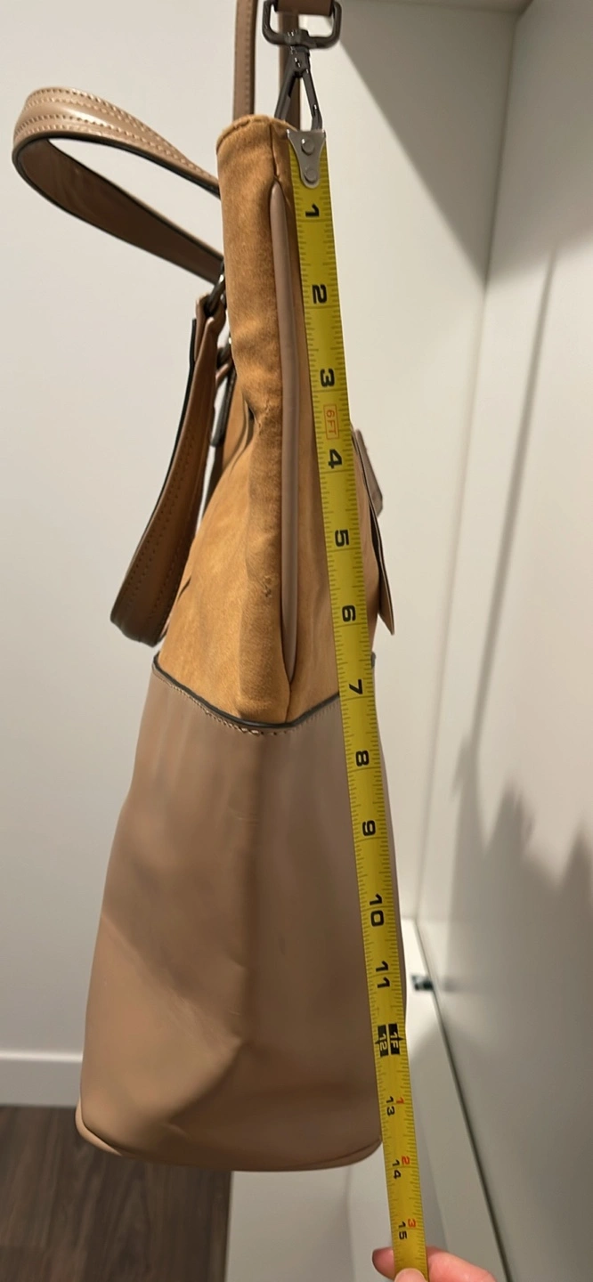 Beige and brown tote bag. Features two top handles and a detachable shoulder strap. Zip closure. Interior lining. Excellent condition.